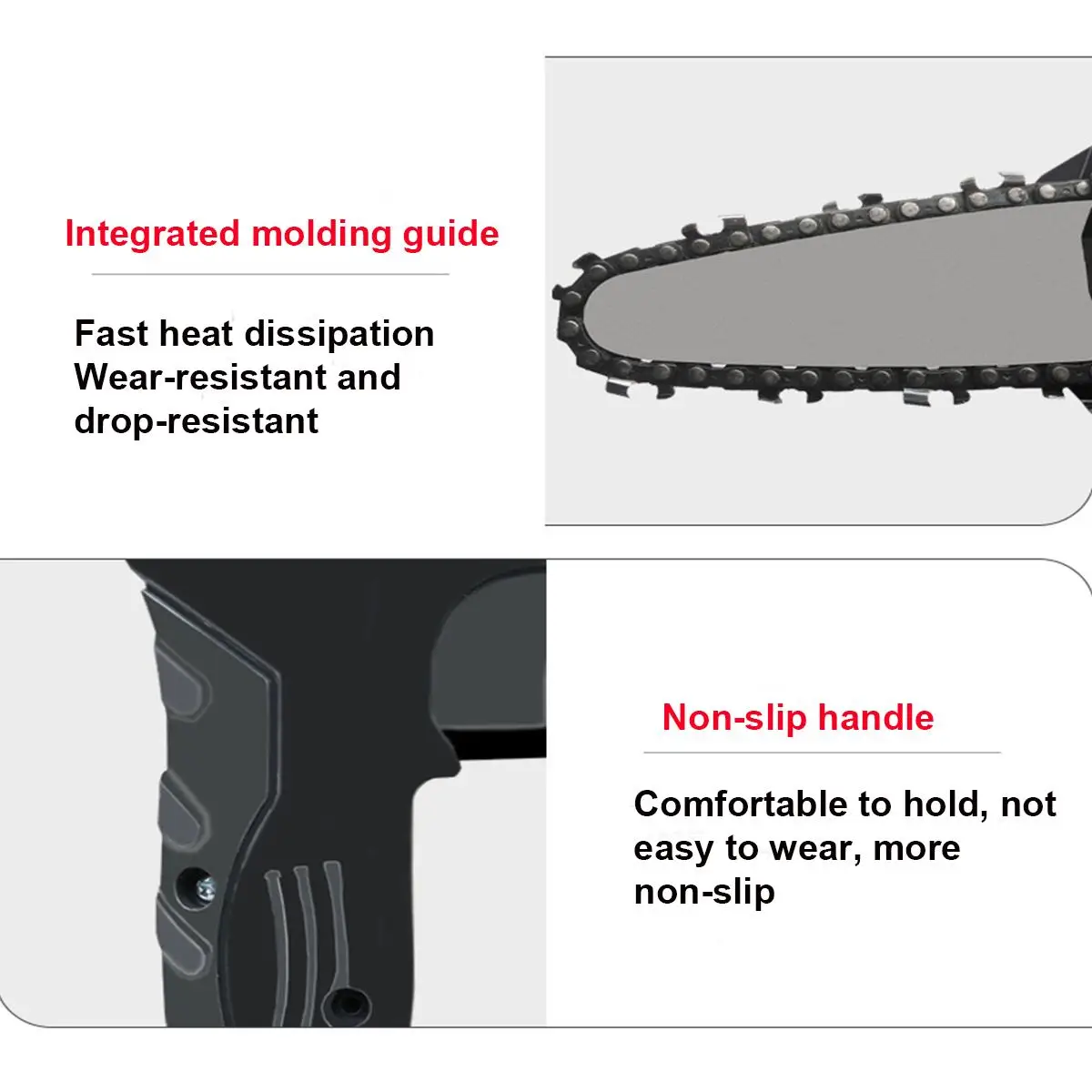 Характеристика:-Эргономичная ручка, которая очень удобна и безопасна для переноски.-Ручка имеет противоскользящий дизайн, который очень удобен для захвата.-Безопасность пилы, эффективно повышает эффективность вашей работы.-Бесступенчатая скорость, более детальная обрезка, лучшая защита деревьев.-Цепи пилы закаливают, закаляют и отжигают. Они долговечны, чем обычные цепи пилы.