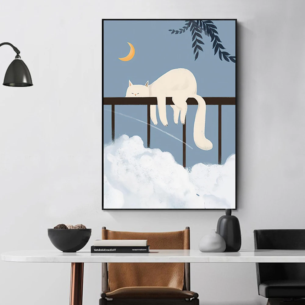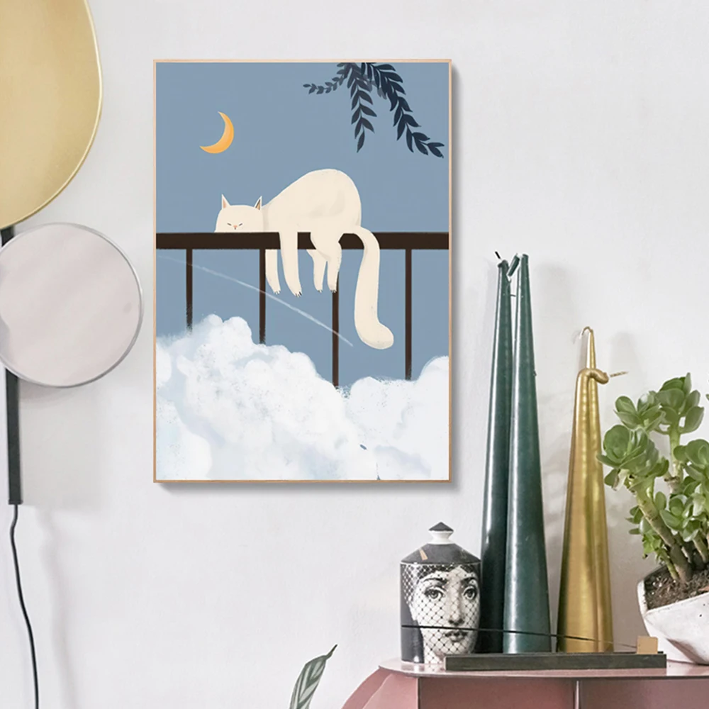 Картина на холсте, Настенная картина, мультфильм, сон, Белый Кот, принты, картины, современный синий Ночной пейзаж, плакат для украшения спальни icon star icon star icon star icon star icon star