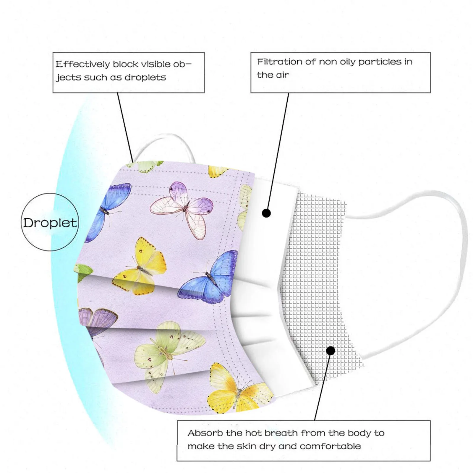 В Одноразовая маска изготовлена из 3 слоев нетканого материала, Безопасен и безопасен для использования. Дышащий материал и красивый Узоры, которые делают его полезным и модным. Специальный 3 слоя из нетканого материала Дизайн, обеспечивает некоторую защиту от пыли, автомобильных выхлопных газов, Пыльца и т. д. эластичная Ушная петля, легко носить и не давит на уши.