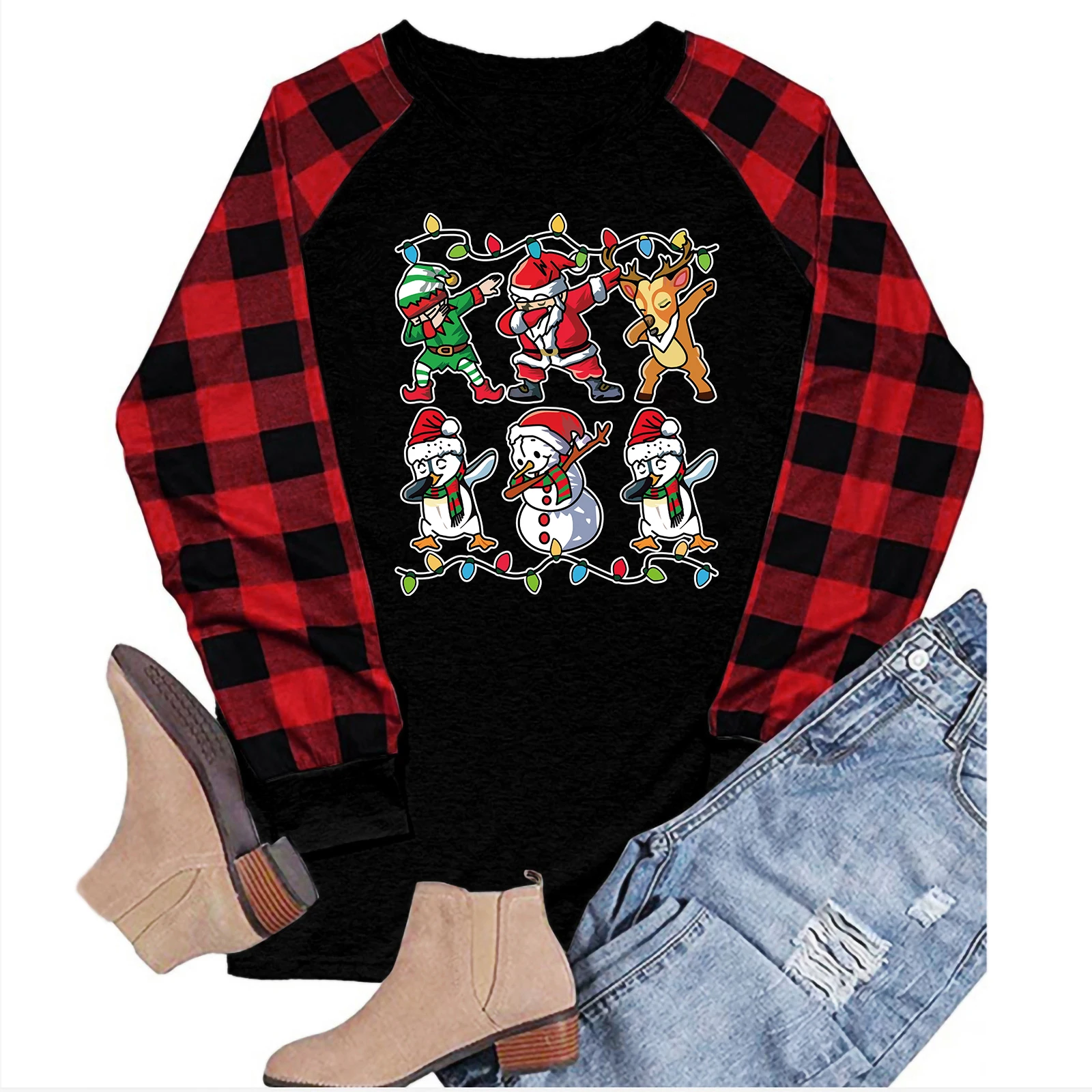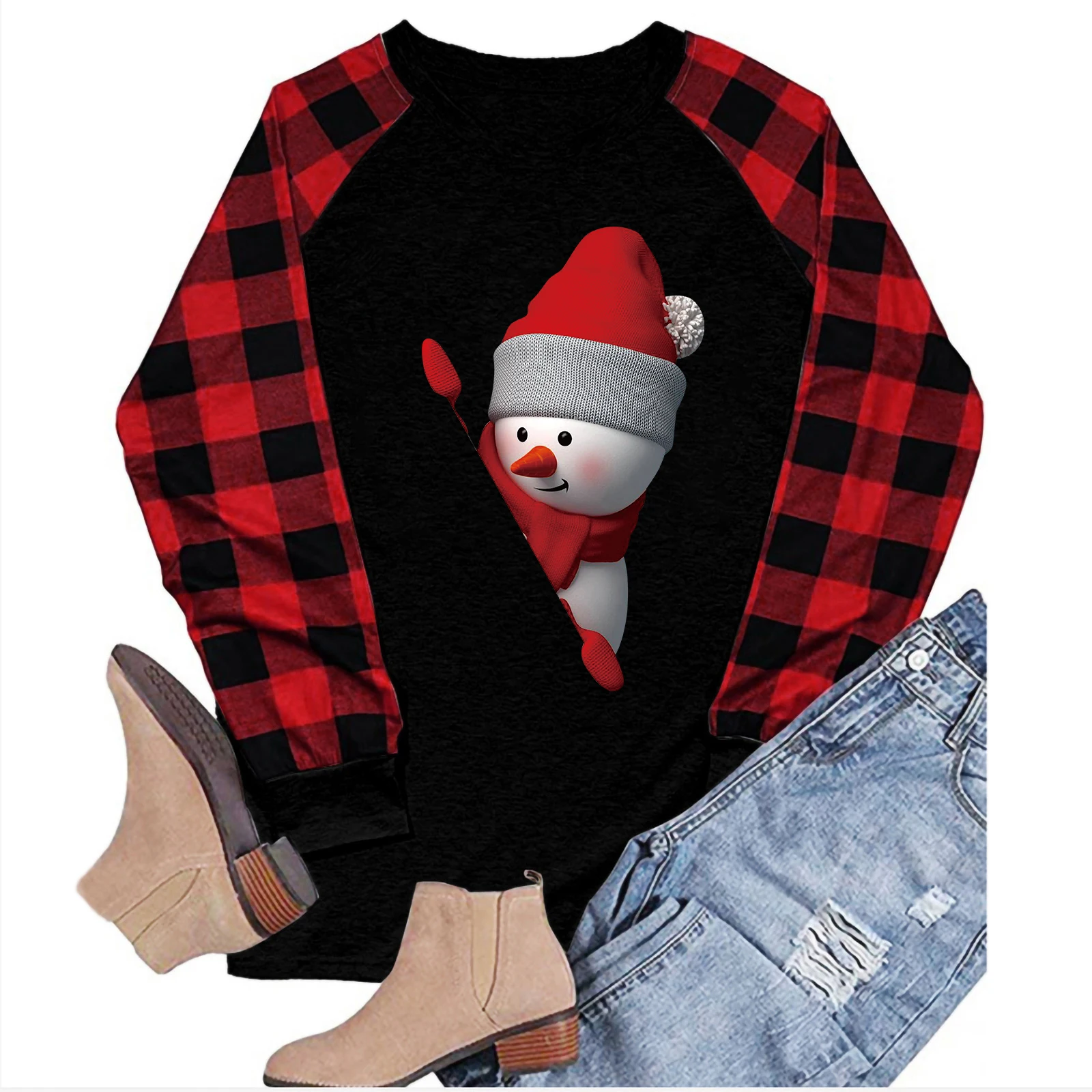 2021 Веселый Рождественский Снеговик принт забавная женская футболка с длинным рукавом черно-белые клетчатые рукава Осенние Топы футболки женская рубашка