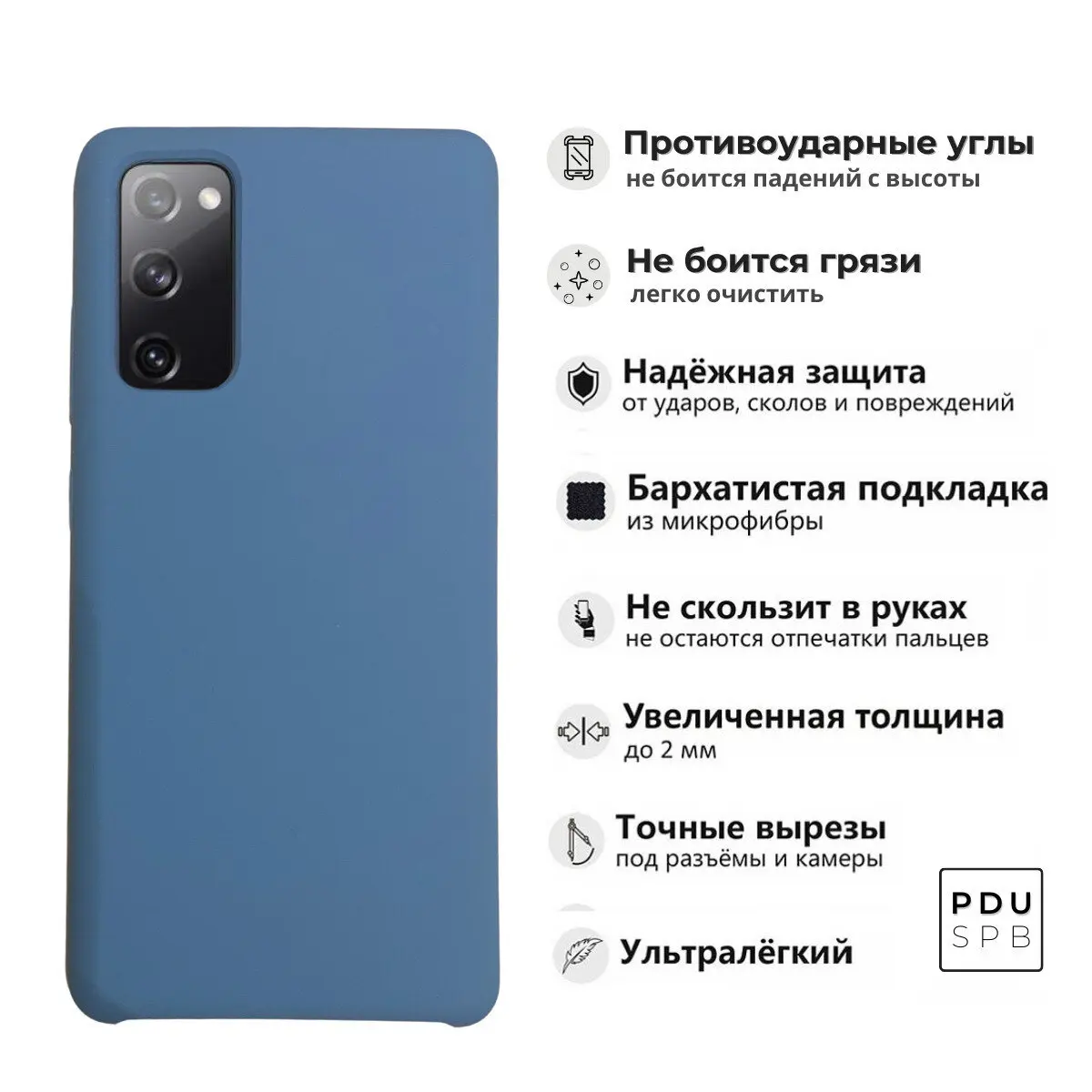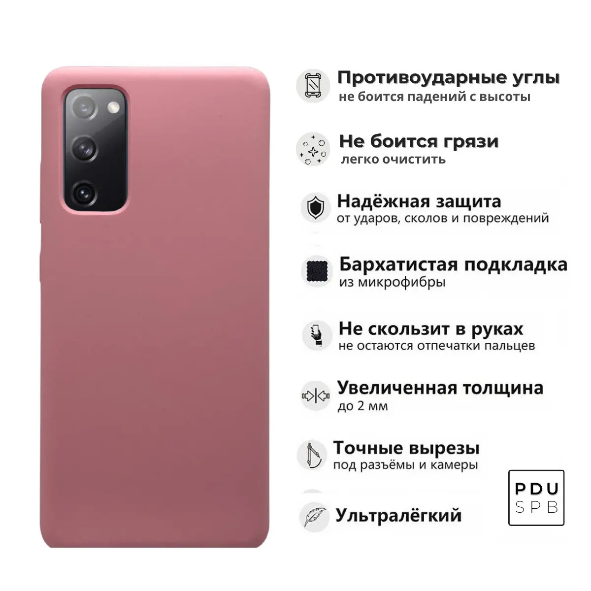 Этот шикарный чехол для Samsung Galaxy S20 FE / Самсунг Галакси С20 ФЕ изготовлен из высокотехнологичного непрозрачного TPU полимера, обладающего высокой прочностью на разрыв и пластичностью. Чехол имеет очень приятное на ощупь, бархатистое Soft Touch покрытие премиального качества, благодаря которому он не скользит в руках и совершенно не пачкается. На внутренней части изделия расположена мягкая подкладка из искусственной замши. Все технические отверстия (под кнопки управления, разъем подключения гарнитуры, камеру) идеально подогнаны по размерам и местоположению.