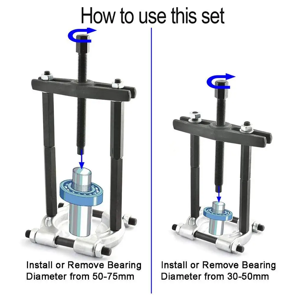 Благодаря кованой конструкции, разделитель подшипника и Набор съемников поставляются с двумя наиболее широко используемыми разветвителями подшипников 30-50 мм и 50-75 мм, вместе с тянущими компонентами для безопасного удаления подшипников. В комплект также входит пулер типа бар с винтом 9/16 ".