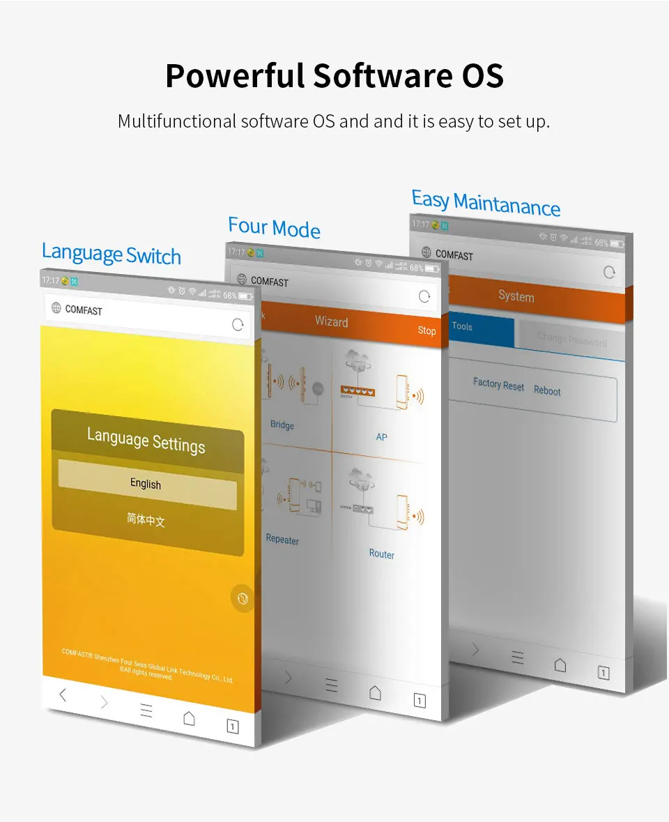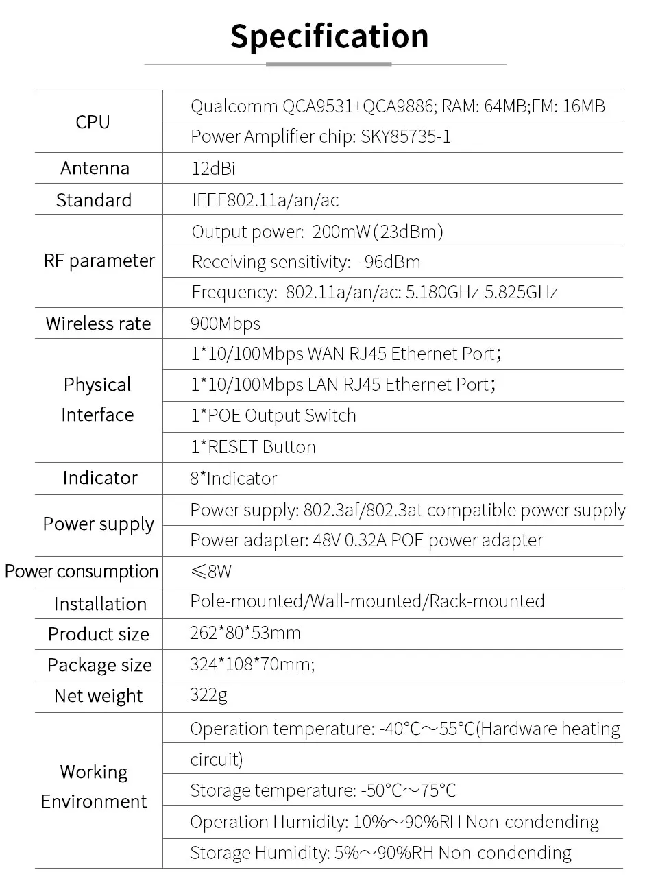 Оснащен 1*10/100M LAN портов, 2 раза Ethernet скорость передачи данных быстрее, чем обычные CPE, поддержка шлюза (PPPOE, статический IP, динамический IP), беспроводной AP, Wi-Fi репитер, WDS режим работы