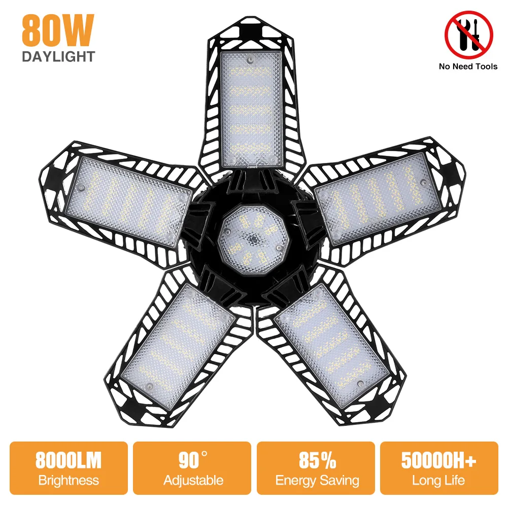 Светодиодный светильник для гаража с пятью листьями, складной потолочный светильник для гаража, комнатный и уличный деформационный светильник для высоких промышленных помещений