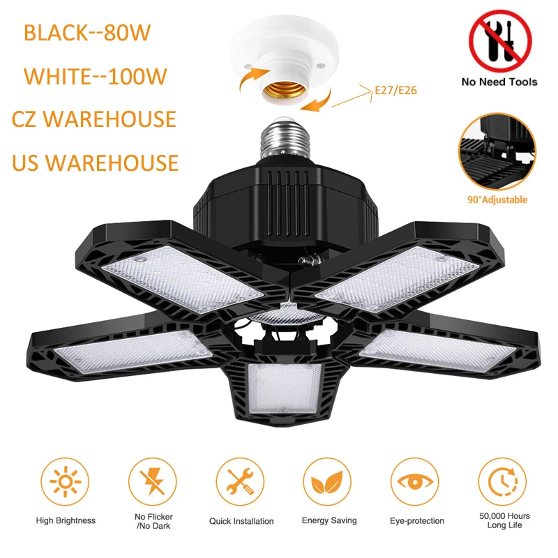 1.Большой светильник, излучающий поверхность: 5 складной светильник-излучающие панели + средний Светильник-излучающая поверхность, увеличенный светильник-излучающая область, без темных зон. Верх прозрачной модели 100 Вт также может излучать светильник, и нет слепого пятна на светильник ing.2.Характеристики продукта: 80 Вт/100 Вт Мощность, высокий светильник 2835LED, 6000K-6500K холодный белый светильник. Эти советы помогут продлить срок службы изделия может достигать 50000 часов. Подходит для семей, гаражей, складов и т. д.3.Светильник и тонкий корпус лампы: Используется только качественный АБС-пластик + Поликарбонат материал, тело лампы светильник и тонкий, не просто к окислению и коррозии, имеет хорошую рассеивания тепла производительность, и она более прочная и долговечная.4.Складная конструкция:5 панелей-светильник можно сложить на 0-90 °, гибко отрегулировать для освещения различных углов, для удовлетворения различных потребностей.5.Быстрая установка: Подходит для держателей ламп E26/E27, которые могут быть установлены быстро без инструментов, экономя время и усилия.