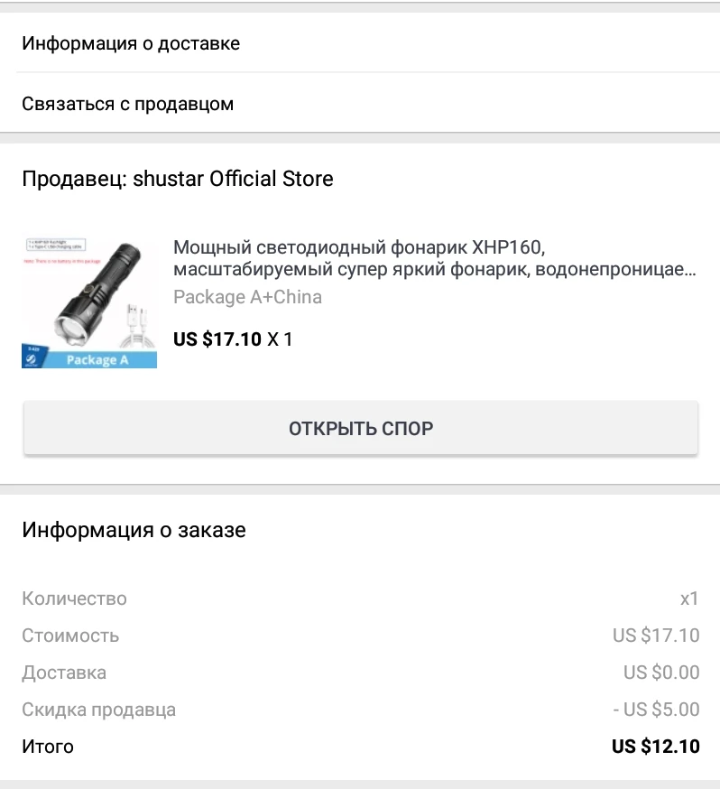 ФОНАРИК СУПЕРСКИЙ !!! ДОСТАВКА ВСЕГО 4 НЕДЕЛИ, ПО УКРАИНЕ ''УКРПОЧТОЙ'',УПАКОВАН НЕПЛОХО (В ПУПЫРКУ, и ПОЧТОВЫЙ ПАКЕТ). ОПИСАНИЮ НА САЙТЕ ПОЛНОСТЬЮ СООТВЕТСТВУЕТ, ВЕС 238 грамм,5 РЕЖИМОВ СВЕЧЕНИЯ, К ФОНАРИКУ ИДЕАЛЬНО ПОДХОДИТ АККУМУЛЯТОР 26650, ХОТЯ МОЖЕТ РАБОТАТЬ И ОТ АККУМУЛЯТОРОВ 18650 И 21700.В ОБЩЕМ И В ЦЕЛОМ ОЧЕНЬ-ОЧЕНЬ КЛАССНЫЙ ФОНАРИК И ВСЕГО ЛИШЬ ЗА 12,10$//310гривень.ОГРОМНОЕ СПАСИБО МАГАЗИНУ И ПРОДАВЦУ ЗА ХОРОШУЮ СКИДКУ, И ЗА ОТЛИЧНО ВЫПОЛНЕННЫЙ ЗАКАЗ !!!