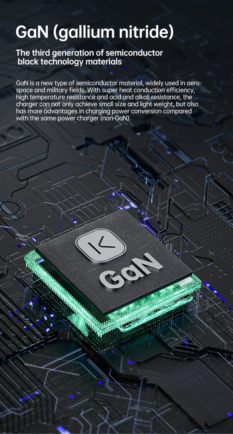 Третье поколение полупроводниковых материалов black technology GaN-это новый тип полупроводникового материала, широко используемый в аэрокосмической и военной областях. Благодаря высокой теплопроводности, высокой термостойкости, кислоте и щелочности зарядное устройство может не только достичь небольшого размера и веса, но и светильник, но также имеет преимущества в преобразовании мощности зарядки с таким же зарядным устройством (не-GaN).