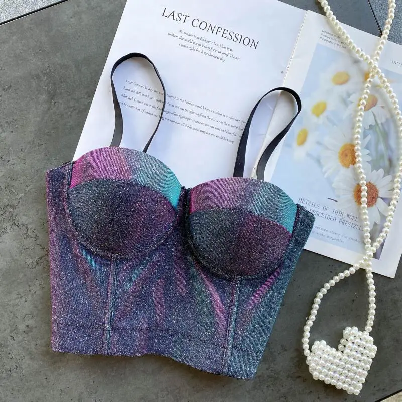 Женский связующий бюстгальтер, корсет, укороченные топы с завязкой на шее, блестящий корсет, топ, боди-труба, ночной клуб, сексуальные блестящие майки