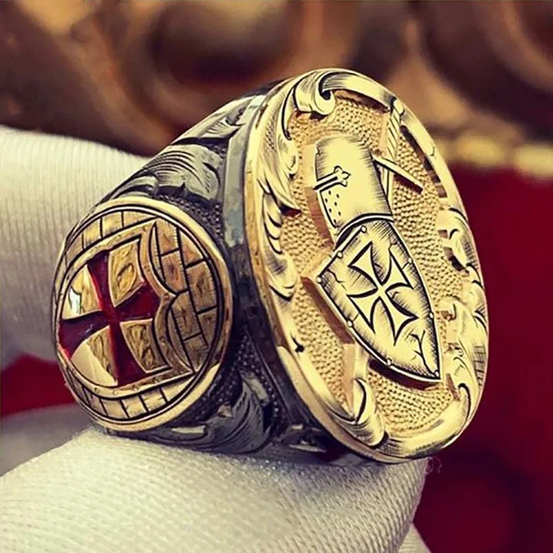 кольца кольцо мужское панк готика бижутерия люкс качества Мужское модное резное кольцо в виде рыцаря, Креста Иисуса Бога, обручальное кольцо из черного золота с красной эмалью, роскошные рождественские украшения Anillo
