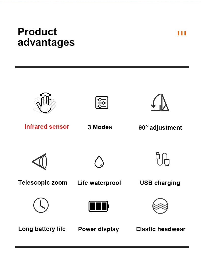 1. Мощный светодиодный фонарь использует светодиодный XHP160, Максимальный световой поток-800000.2. Умный индукционный дизайн. Свободные руки, может выключить свет даже занят.3. В любом режиме удерживайте нажатой переключатель 3 секунды, переходите в режим датчика.4. В пределах 15 см от чувствительного положения, можно включить/выключить налобный фонарь с волной рук.5. Используйте 3*18650 перезаряжаемые батареи, после полной зарядки, он используется для использования до 12 часов.6. Телескопический зум, сфокусированный светильник используется для дальнего светильник, яркий на больших расстояниях. Масштабируемый светильник, широкий диапазон освещения.7. 3 режима: высокий/низкий/стробоскоп (прост в использовании в различных сценариях).8. 4 уровня отображения мощности (25%, 50%, 75%, 100%), оставшаяся мощность четко видна.9. Вход Micro USB, подходит для компьютера USB, автомобиля USB, другие USB вилки для зарядки.10. Выход USB (5 в 2 а), может быстро заряжать мобильные телефоны или другие электронные продукты 5 В.11. Регулируемый ремешок для фар, легко надевается и снимается, подходит для всех.12. Водонепроницаемый класс соответствует IPX-6, может использоваться в дождливые дни, но не может быть помещен в воду.13. Изготовлен из авиационного алюминиевого сплава, прочный HAIII военный Жесткий анодированный.14. Подходит для работы, прогулок, кемпинга, велоспорта, рыбалки, патрулирования, бега, альпинизма и других видов деятельности.