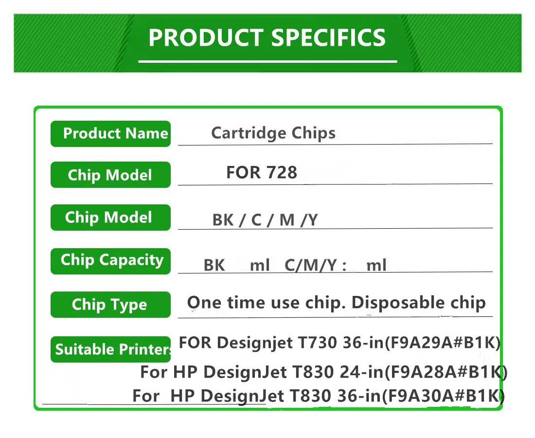 Название продукта: картридж, одноразовая микросхемаНомер картриджа: для HP 728Номер детали OEM:130 мл C - F9J67A130 мл M - F9J66A130 мл Y - F9J65A300 мл MBK - F9J68AЦвет картриджа: MBK / C / M / YЕмкость чипа: MBK - 300 мл C M Y - 130 мл/Тип чипа: новая версия HP728 картридж чип, стабильное качество и показать уровень чернилПреимущество: одноразовое использование, подключи и работайГарантия: в случае обнаружения дефекта замена 1:1