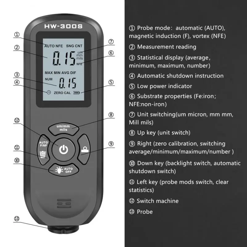 1. Толщиномер используется для измерения толщины покрытого и покрытого листа на металле, например, краска/эмаль/хром на стали, краска и анодированное покрытие на алюминии/меди.