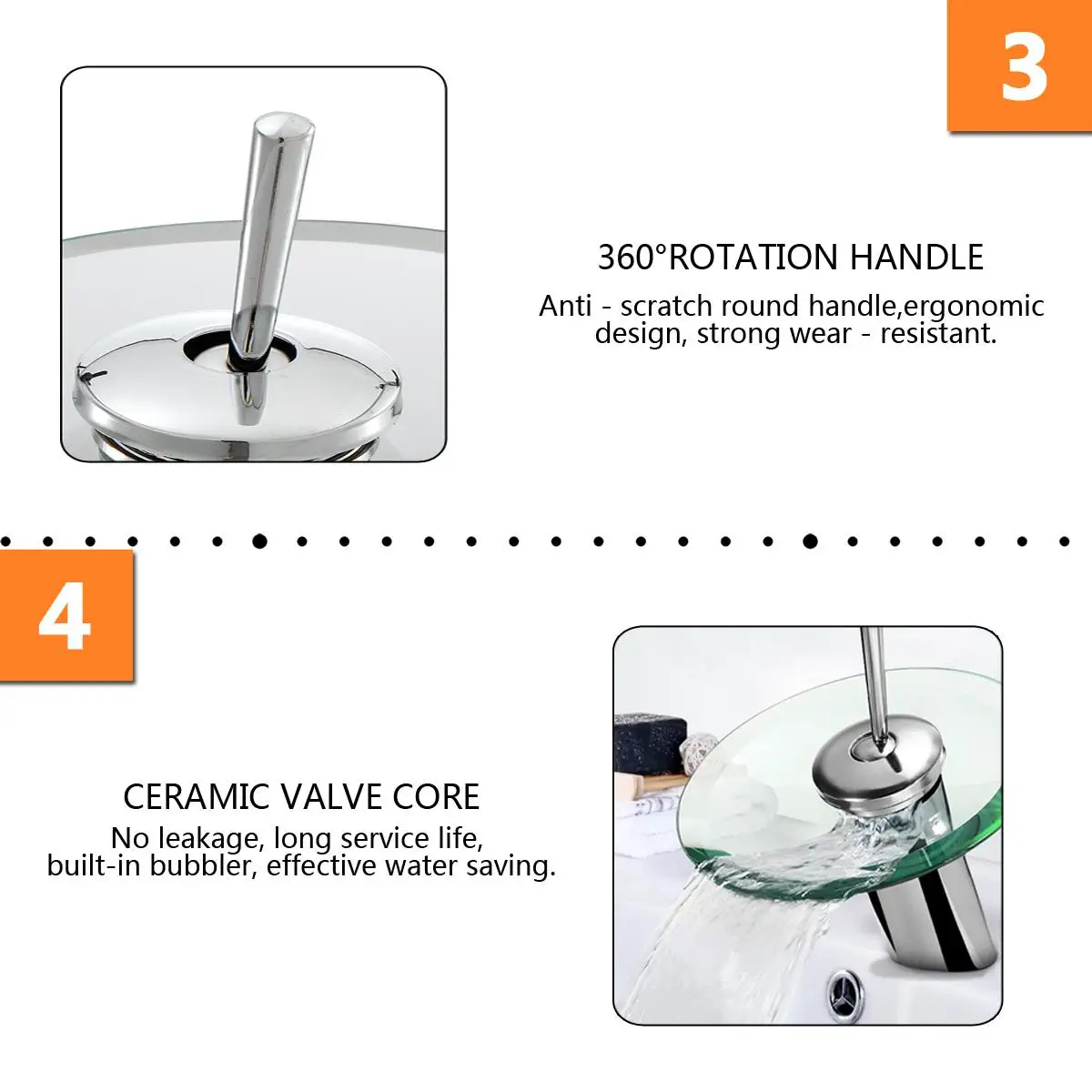 Особенности товара:Особенности:Однорычажный смеситель для раковины из цельного стекла с водопадомКран Наклонный дизайн водопады из воды, и поверхность сделана из толстого плексигласа, личный вкус и мода, ручка может вращаться на 360 градусов.Горячая и холодная вода. 2 подушки покрывают небольшие аксессуары, два шланга 50 см, диаметр стеклянного диска 18 см, эффекты водопада, придавая Вам различное ощущение купания с горячей и холодной водой!