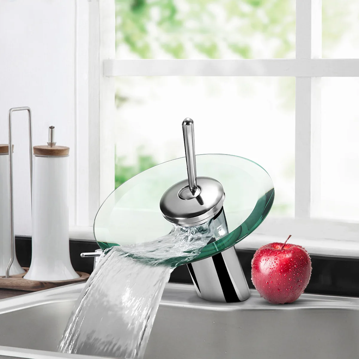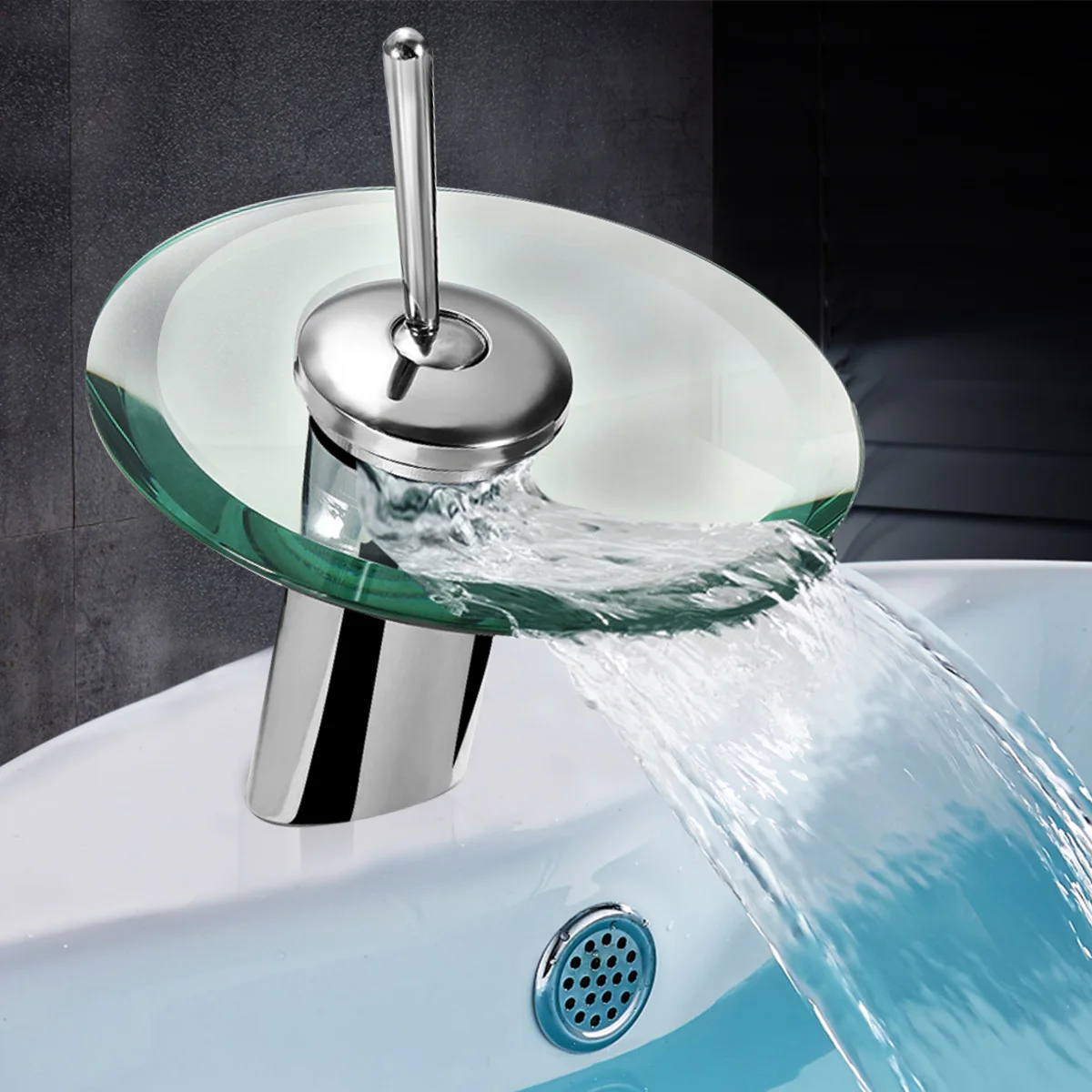 Хромированный полированный стеклянный кран со стеклянным краем, смеситель для раковины в ванной комнате, водопад, для холодной и горячей воды, крепление на раковину
