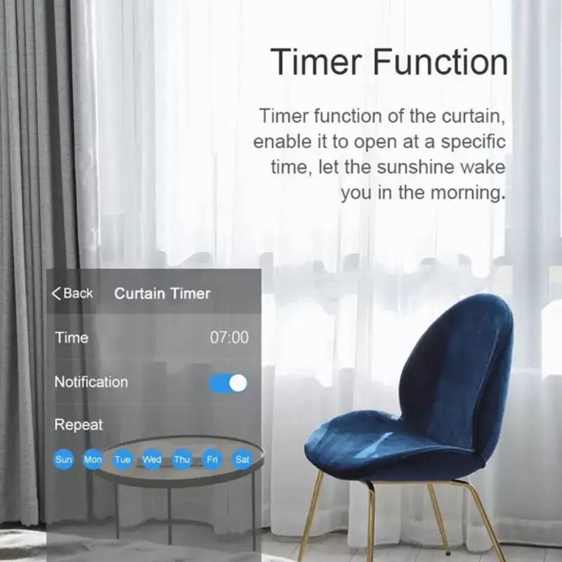 【Функция синхронизации 】вы можете установить таймеры запланированного/обратного отсчета в приложении, чтобы включить/выключить ваш электронный занавес. 7:00 открыть занавеску, пусть солнце медленно разбудит вас утром. 22:00 закрыть занавеску, режим сна обеспечивает комфорт.