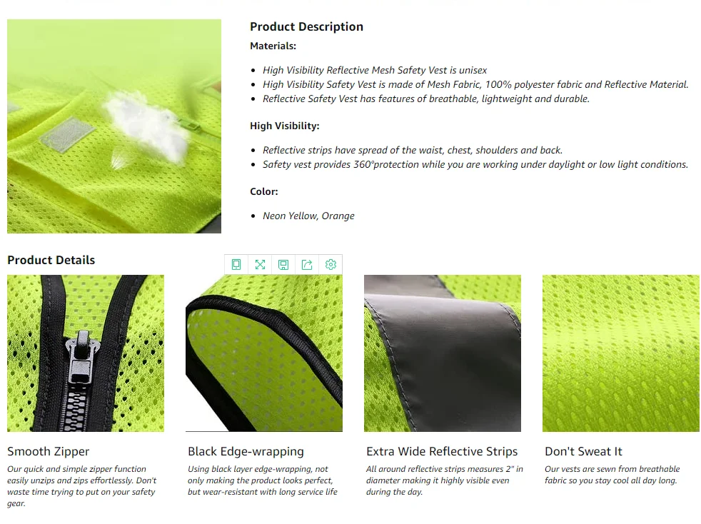 [Светоотражающие полосы]: 2 вертикальных и 2 горизонтальных отражающих полосы с 2 ”шириной на обоих, передней и задней, для максимальной видимости при любой погоде и условиях освещения. Воздухопроницаемость: легкая и удобная ткань из 100% полиэстера