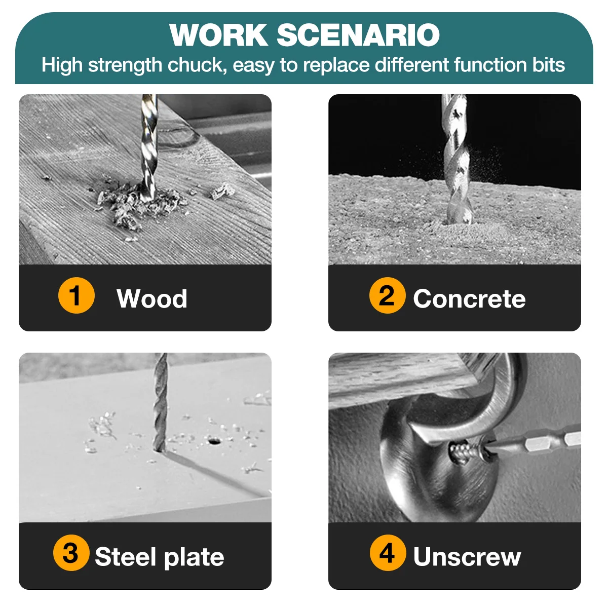 ▲ 3 функции настройки. 3 сверла (плоское сверление, поворотные винты и ударное сверление) режимы для высокоточной работы.