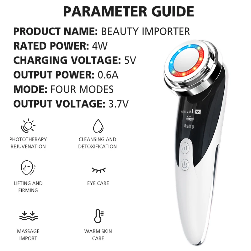 Меры предосторожности при использовании авиационного оборудования:1. Нажмите и удерживайте кнопку питания в течение 3 секунд, чтобы включить, она не может быть повернутаВо время зарядки;2. Во время использования удерживайте сенсорные полоски с обеих сторон корпусаПальцы, и массажная головка контактирует с кожей, чтобы образовать петлю с человекомКорпус;3. При экспорте Используйте ватный диск. Смочите ватный дискСредство для снятия макияжа или очищающий лосьон. Не используйте его с лицомОчищающее Средство/очищающее масло. (Рекомендуется использовать однослойный ватный диск дляЛучший эффект, слишком толстый влияет на вибрацию.Особенности:Очищающий и омолаживающий косметический инструментЭто косметическое устройство для лица, которое может глубоко очистить, реанимировать и омолаживатьКожи, и улучшает контуры лица. Она включает положительный иОтрицательные ионы + теплый + микро вибрация + красный и синий свет.* Положительные и отрицательные ионы: используя принцип притяжения положительныхИ отрицательные ионы для обратного пола, грязь в глубоких порах звездыЭкспортируется через биологический ток. Тщательно очищает косметические ингредиентыЧерез ионтофорез проникает в кожу.* Вибрация: используя механическую вибрацию и метод стимуляции напряжения,Кожа человека подтягивается, его собственная эластичность повышается, и метаболизмКлетки кожи усиливаются.* Теплый: теплый массаж способствует впитыванию, так что текстура кожиРастягивается и кожа становится полнее.* Красный свет: 640nm-650nm красный свет проникает в дерму для продвиженияКоллаген и эластичность, уменьшает морщины и восстанавливает молодость.* Синий свет: синий свет подавляет акне, снимает акне, сужает поры, акне,Закрытый рот, покраснение и т. Д. Он лучше вылечивает акне и помогает очистить бактерии.