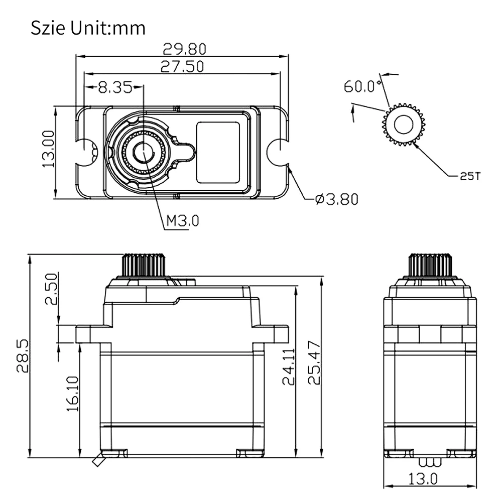 TR-4 характеристики:Крутящий момент (4,8 V): 1,8 кг-см (25,0 унций/дюйм)Крутящий момент (6,0 V): 2,2 кг-см (30,6 унций/дюйм)Крутящий момент (7,4 V): 2,6 кг-см (36,1 унций/дюйм)Скорость:0,15 сек (4,8 V)0,12 сек (6,0 V)0,10 сек (7,4 В)Операционной Напряжение: 4,8 ~ 7,4 DC ВольтВес: 16,0 г (0,56 унций)Тип шестерни: медь и алюминийРабочая температура: -20 ~ 60 °CРабочая частота: 1520 с/50 ГцРазмеры: 22,5x12,5x24,0 мм (0,89x0,49x0,94 дюйма)Посылка включает в себя:1 x Мощность в формате Full HD с разрешением TR-4 2,6 кг Водонепроницаемый сервопривода
