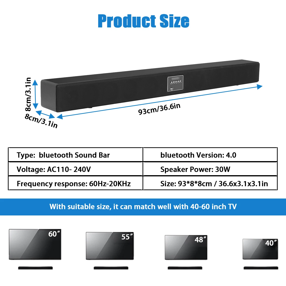 Характеристики:Модель: A079Материал шкафа: деревоЦвет: черныйВерсия bluetooth: 4,0Мощность динамика: 30 ВтМаксимальная мощность: 200 ВтНапряжение: AC110- 240 ВЧип усилителя: CLSS-DSNR (Отношение сигнал-шум): ≥ 75 дБЧастотная характеристика: 60 Гц-20 кГцУправление: ключ/пульт дистанционного управленияРазмер изделия: 93*8*8 см/36.6x3.1x3.1inУдаленная Батарея: 2xAAA батарея (не входит в комплект)Аудио вход: bluetooth/3,5 мм Aux / USBПоддержка: ТВ/ПК/телефон/планшет/ноутбук/MP3 / MP4 / DVD плеер/ТВ коробка аудио