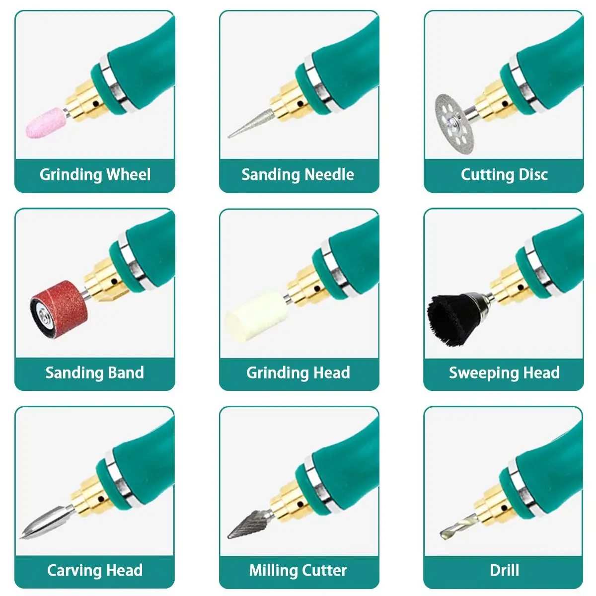 Посылка включает в себя:Тип A:1 x электрическая шлифовальная ручка105 x шлифовальные аксессуары2 x игла для карвинга1 х гаечный ключ1 х USB кабель1 x Руководство пользователя1 х коробка для храненияТип B:105 x шлифовальные аксессуары