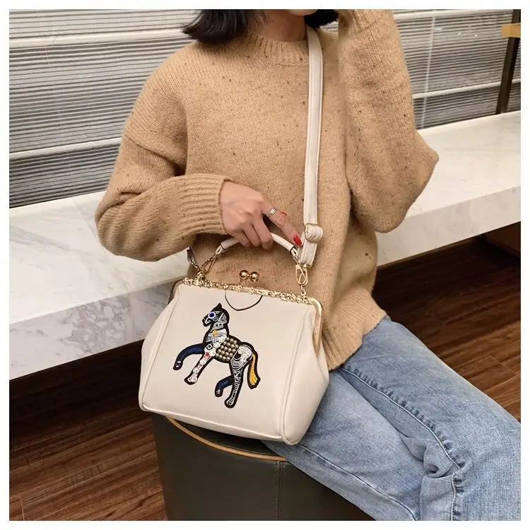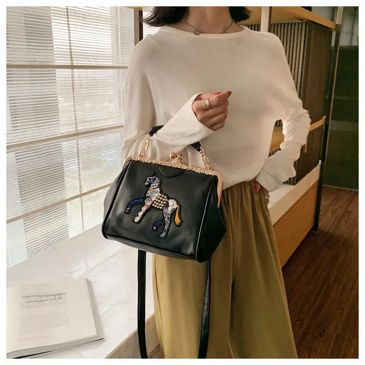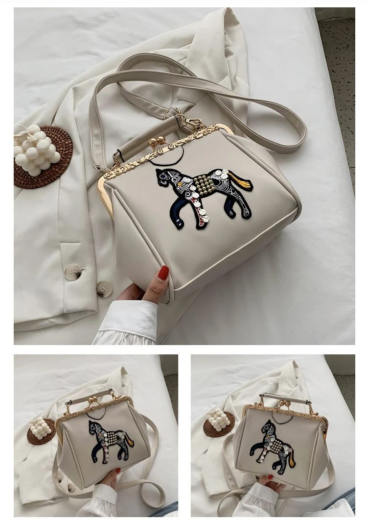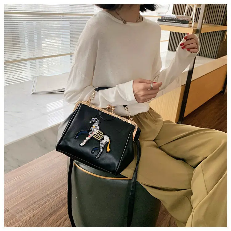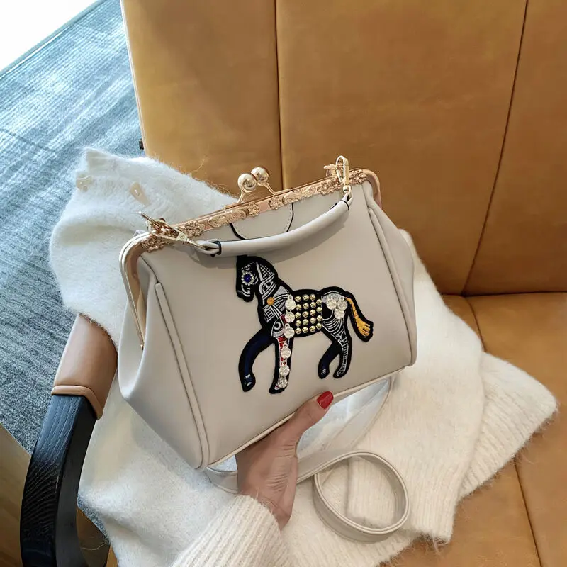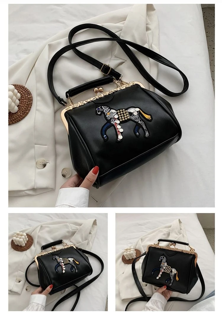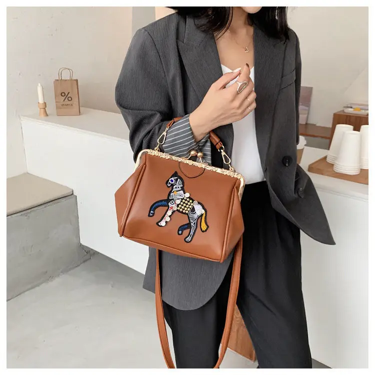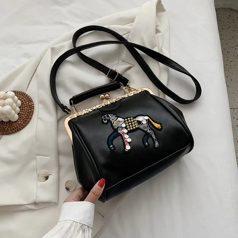 Сумка с вышивкой лошади и замком, винтажная модная сумка из искусственной кожи, женские сумки через плечо, новинка 2021, женские сумки-тоут