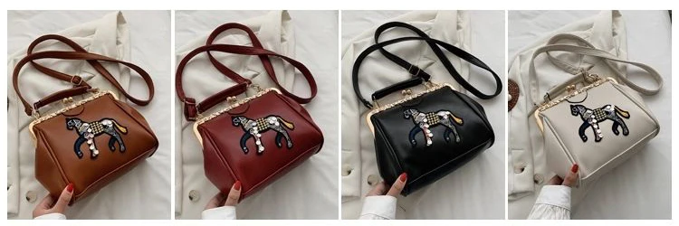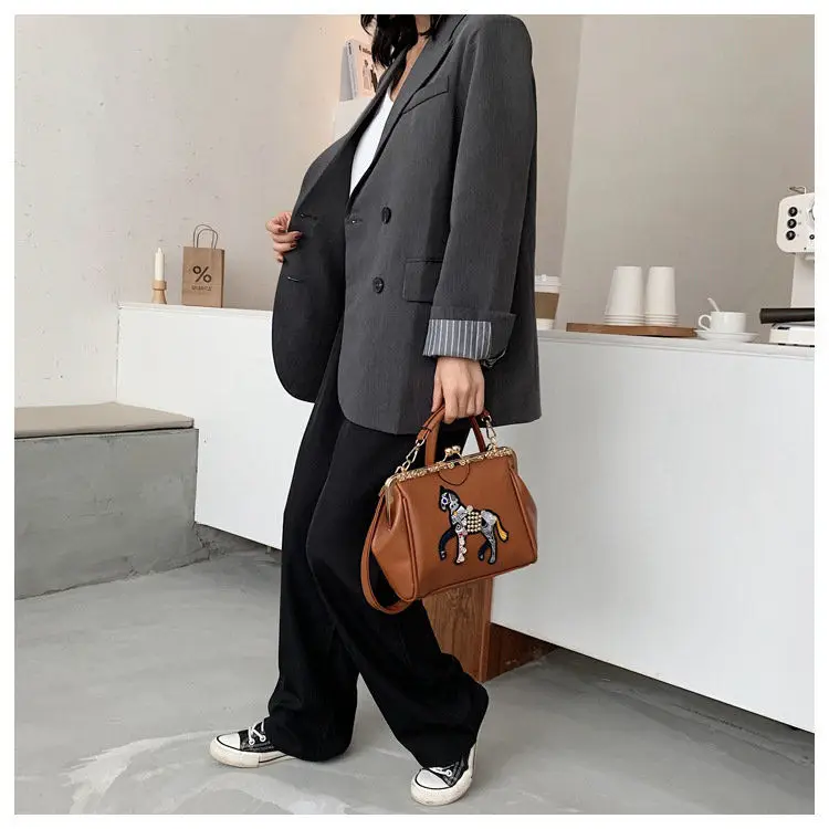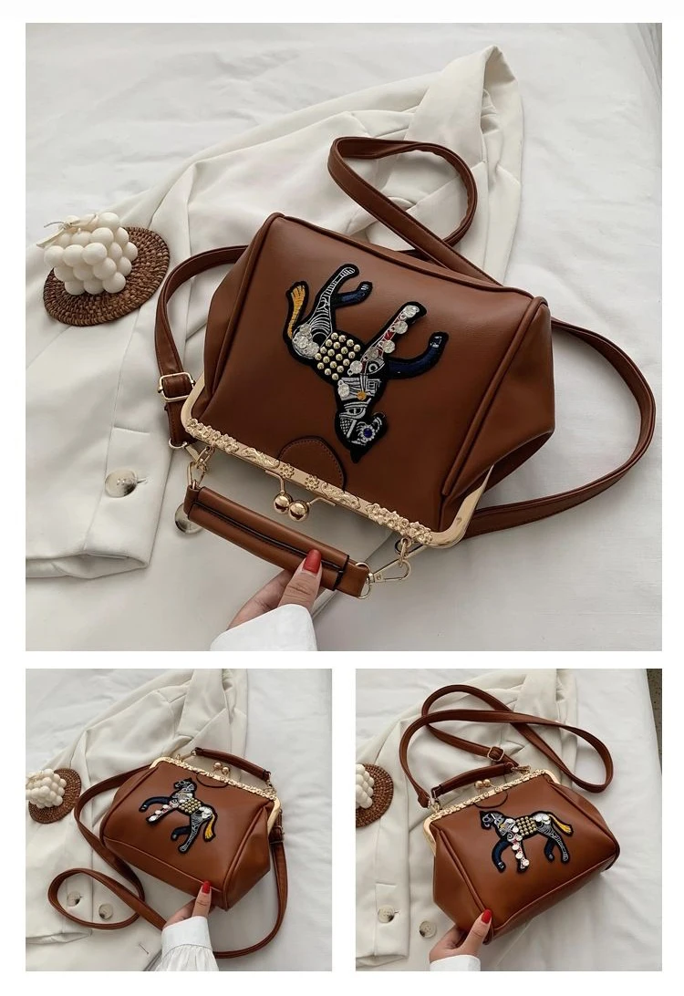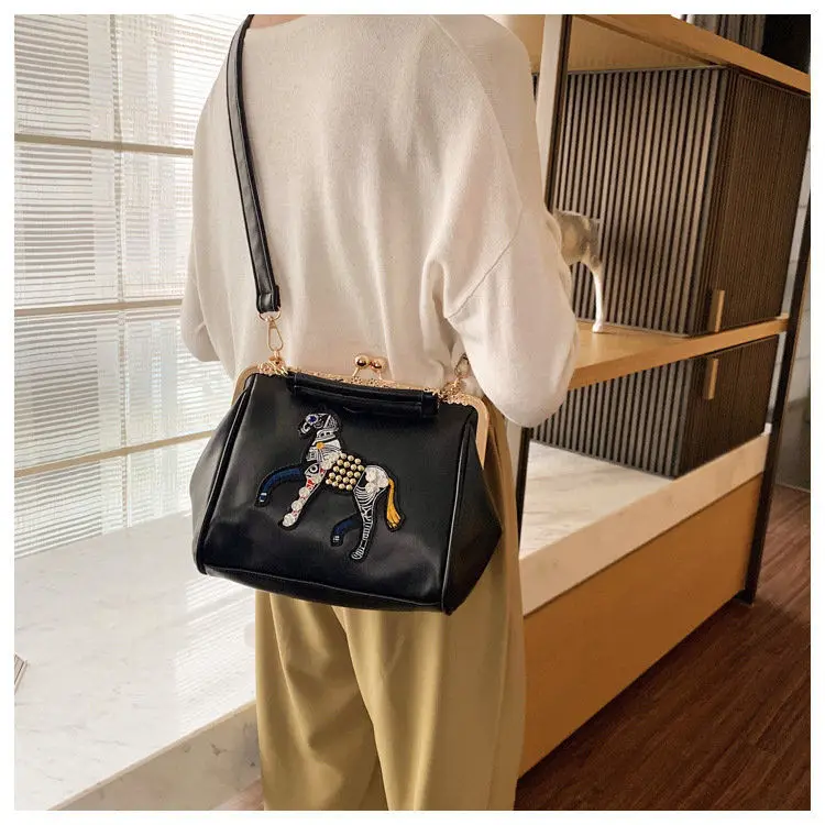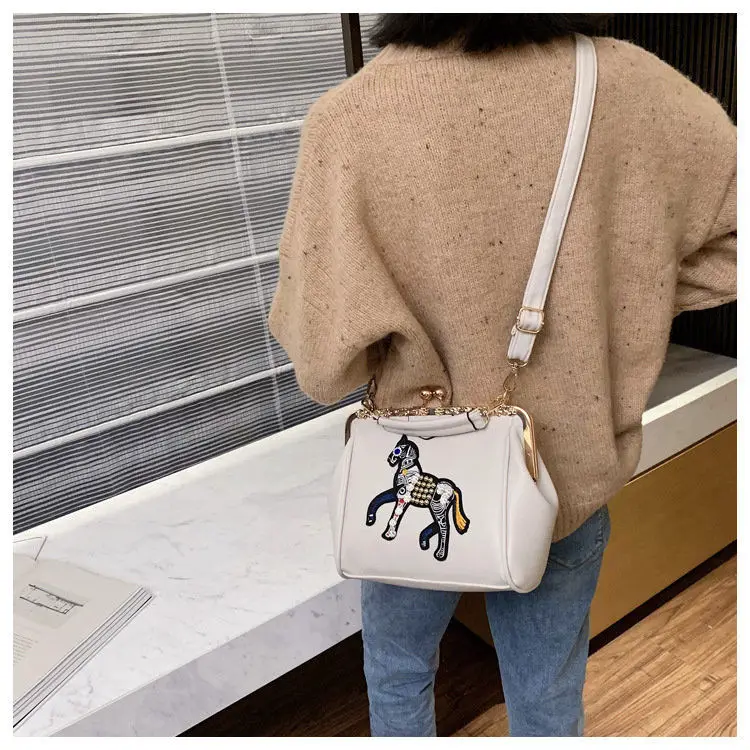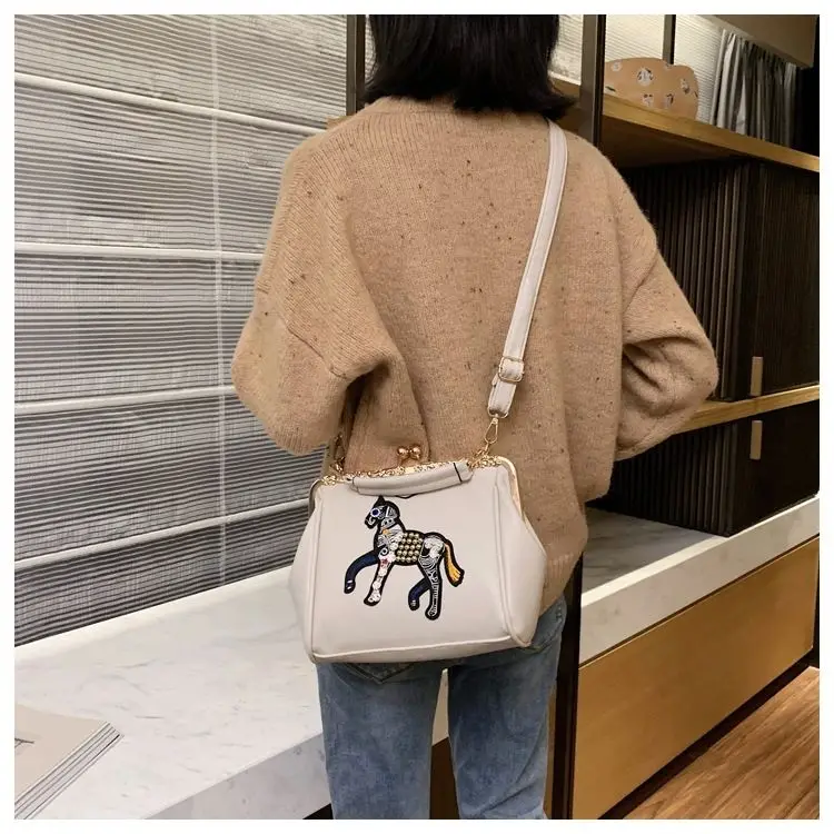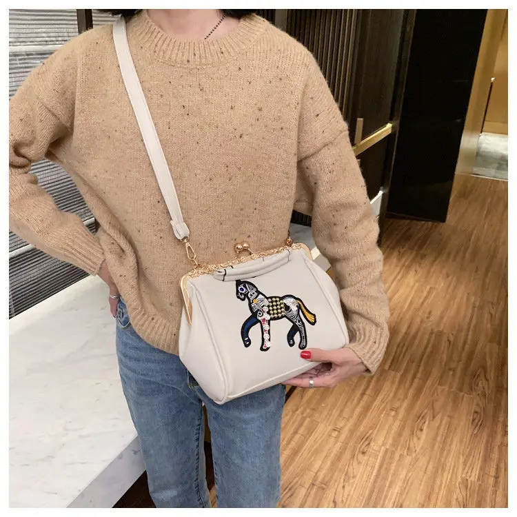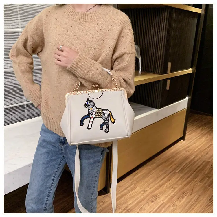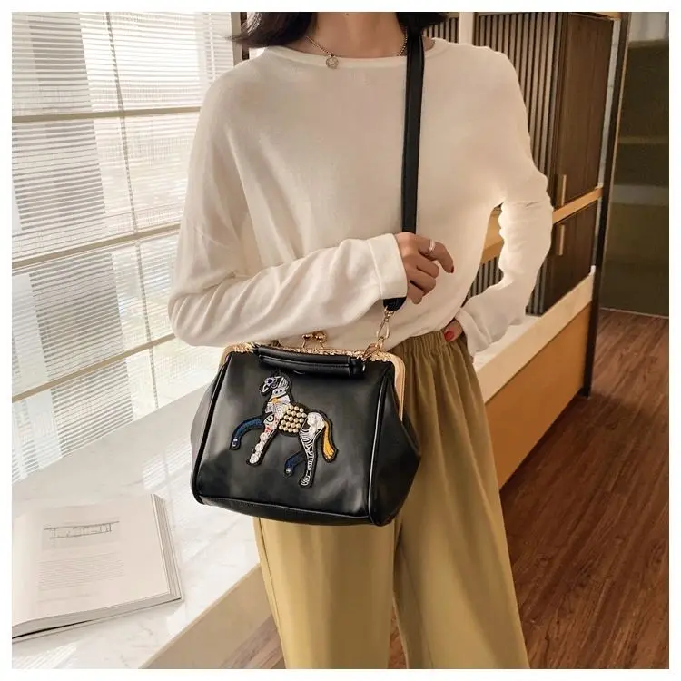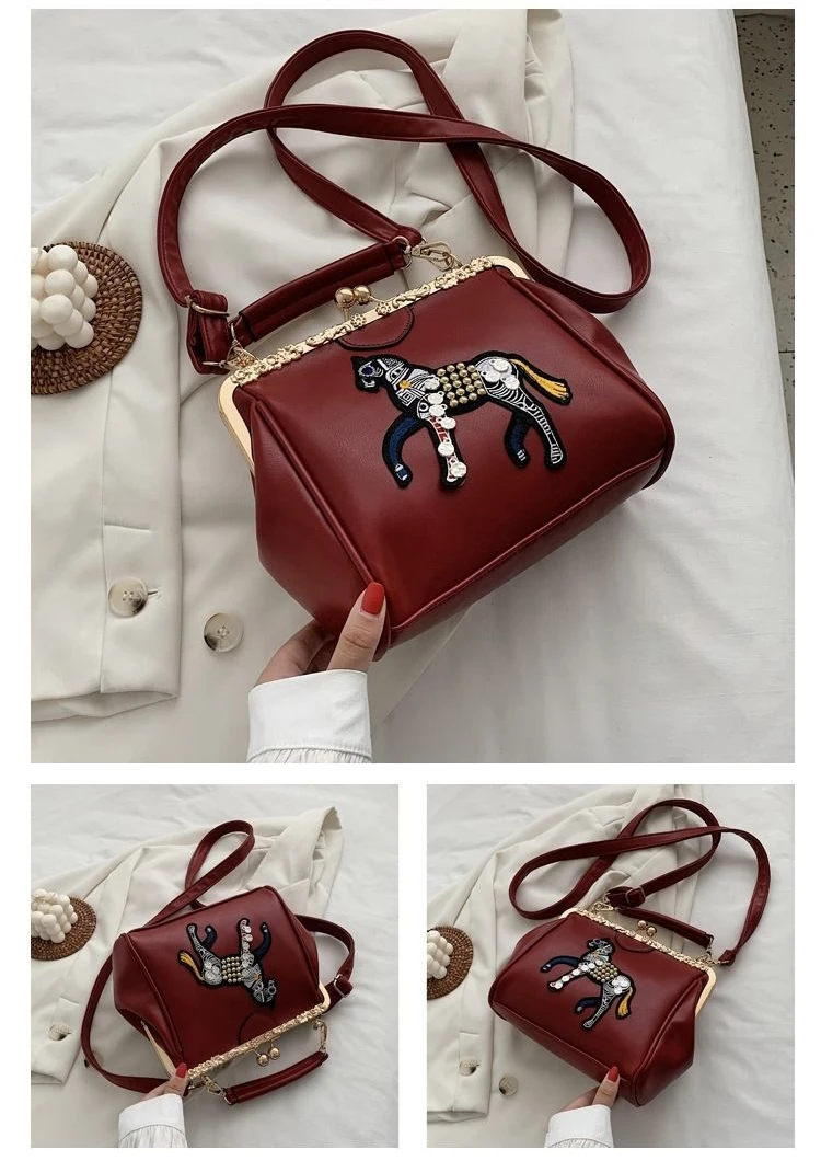 Сумка с вышивкой лошади и замком, винтажная модная сумка из искусственной кожи, женские сумки через плечо, новинка 2021, женские сумки-тоут