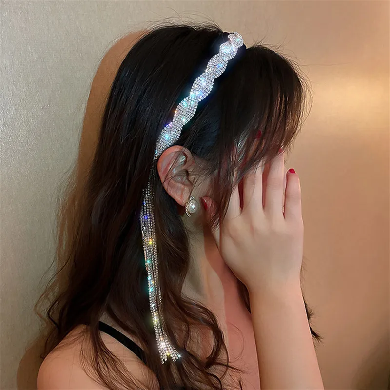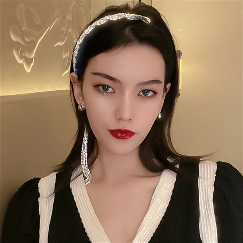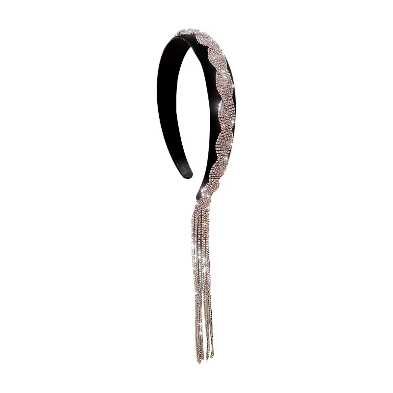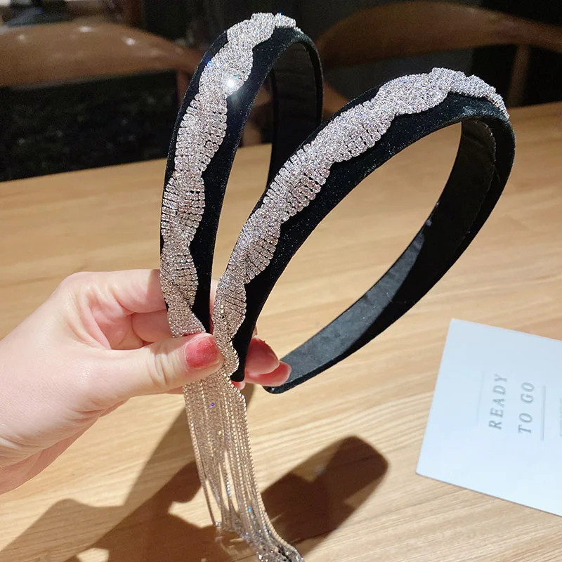 Женская Асимметричная повязка на голову XIALUOKE в Корейском стиле с длинной кисточкой и кристаллами, черная бархатная заколка для волос, свадебные аксессуары для волос, ювелирные изделия
