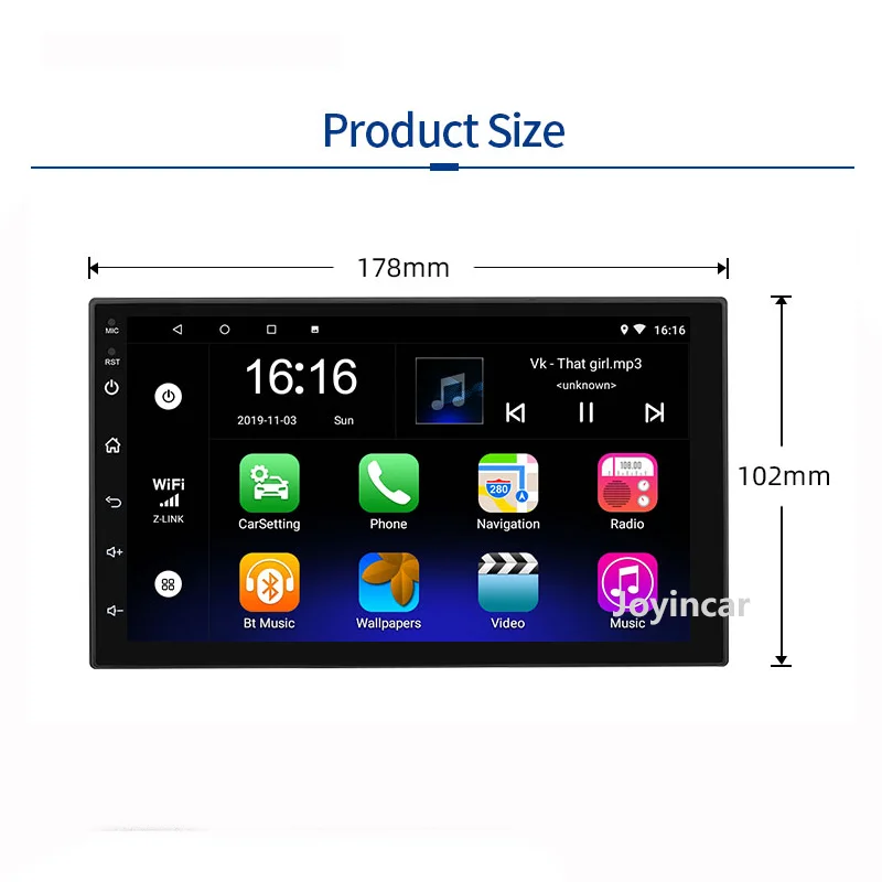 Voltage: DC 12VCPU: A7 1.3GHZx4Operating system: Android 10RAM: 1G/2GROM: 16G/32GScreen size: 7 inch 2.5D Capacitive screenBluetooth Version: 4.0Internal: WifiGPS: SupportRadio Band: FMResolution: 1080PAudio format: MP3 MP2 AAC OGG FLAC APE WMA WAV RM AC3Video format: AVI 3GP/MP4 MOV MPG MKV WMV RMVBLanguage: Chinese, English, Taiwanese, Arabic, Brazilian, Russian, Hebrew, Spanish, Italian, French, Thai, German, Japanese, Korean, Turkish, Czech, Iranian, Hungarian, Dutch, Polish, Swedish, Ukrainian, Vietnamese, Romanian, Greek, Danish, Finnish, etc. 50+ languages