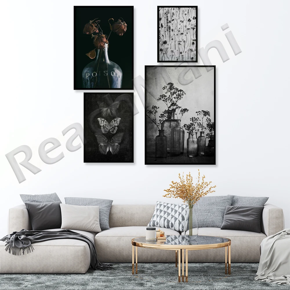 С принтом бабочки, черно-белое искусство, готическое искусство стены, темные принты, Настенный декор, темные ботанические готические принты,