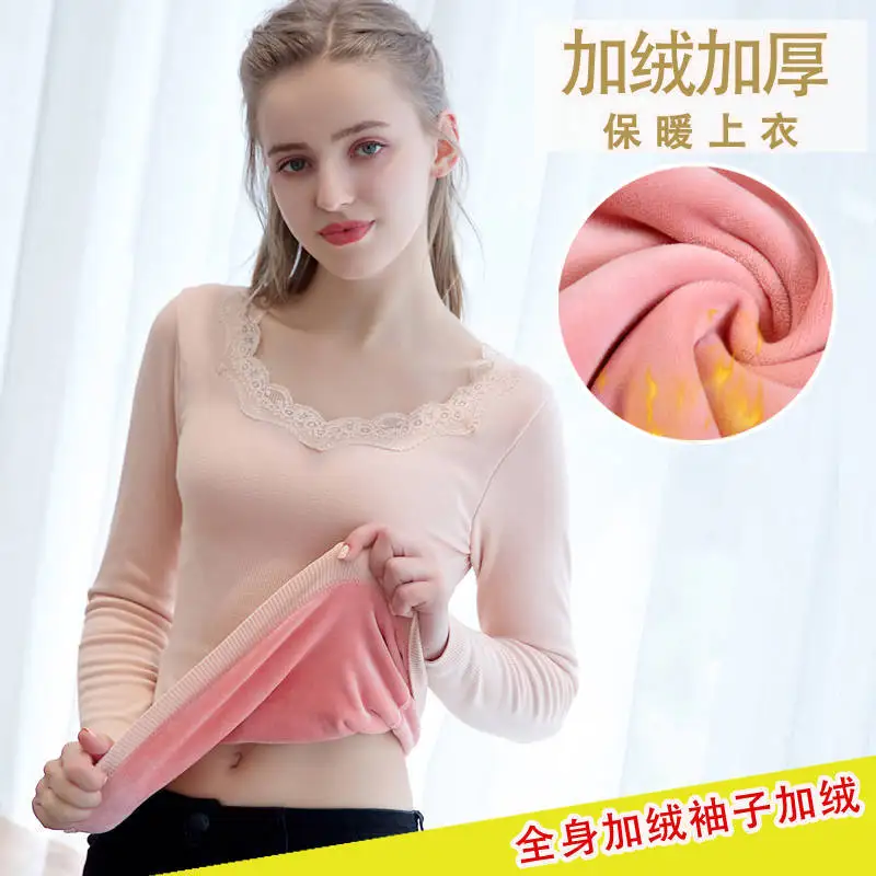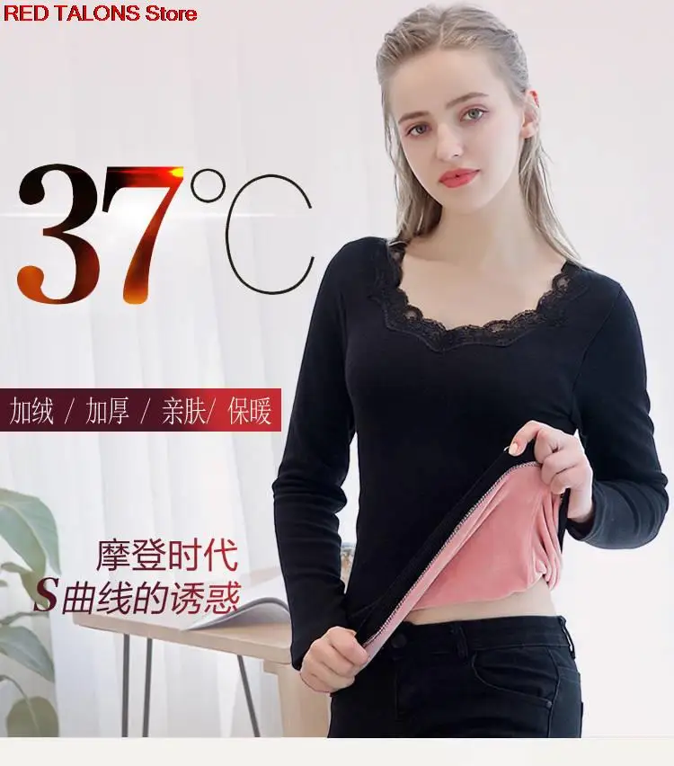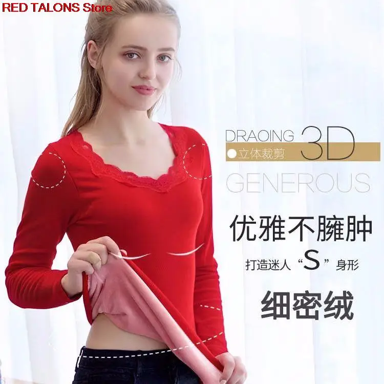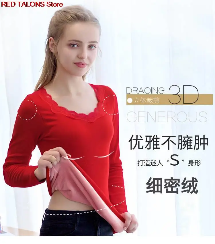 Полностью плюшевое термобелье, Женский утепленный плюшевый цельный топ, облегающая осенняя одежда, кружевная рубашка с V-образным вырезом