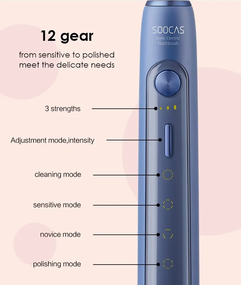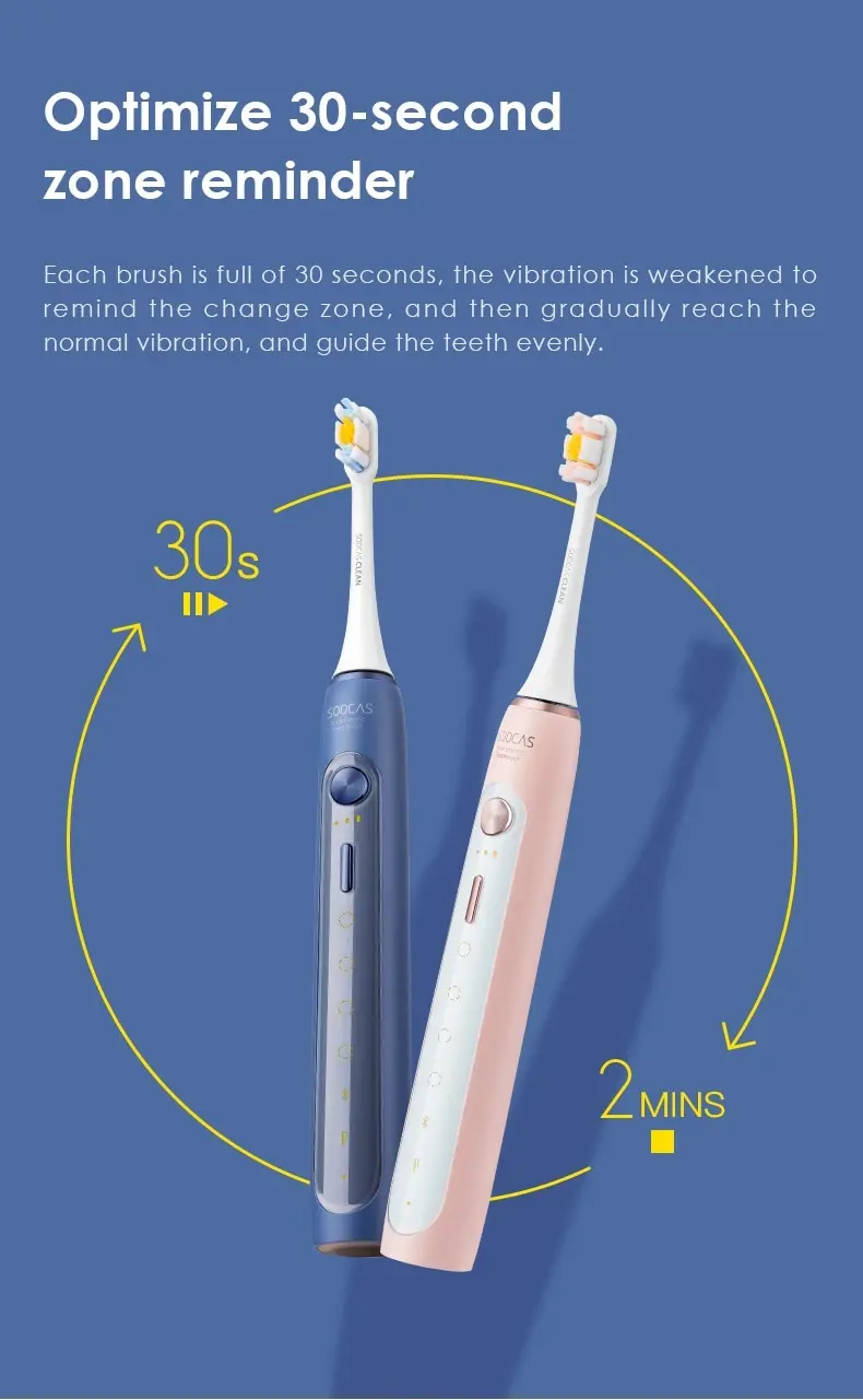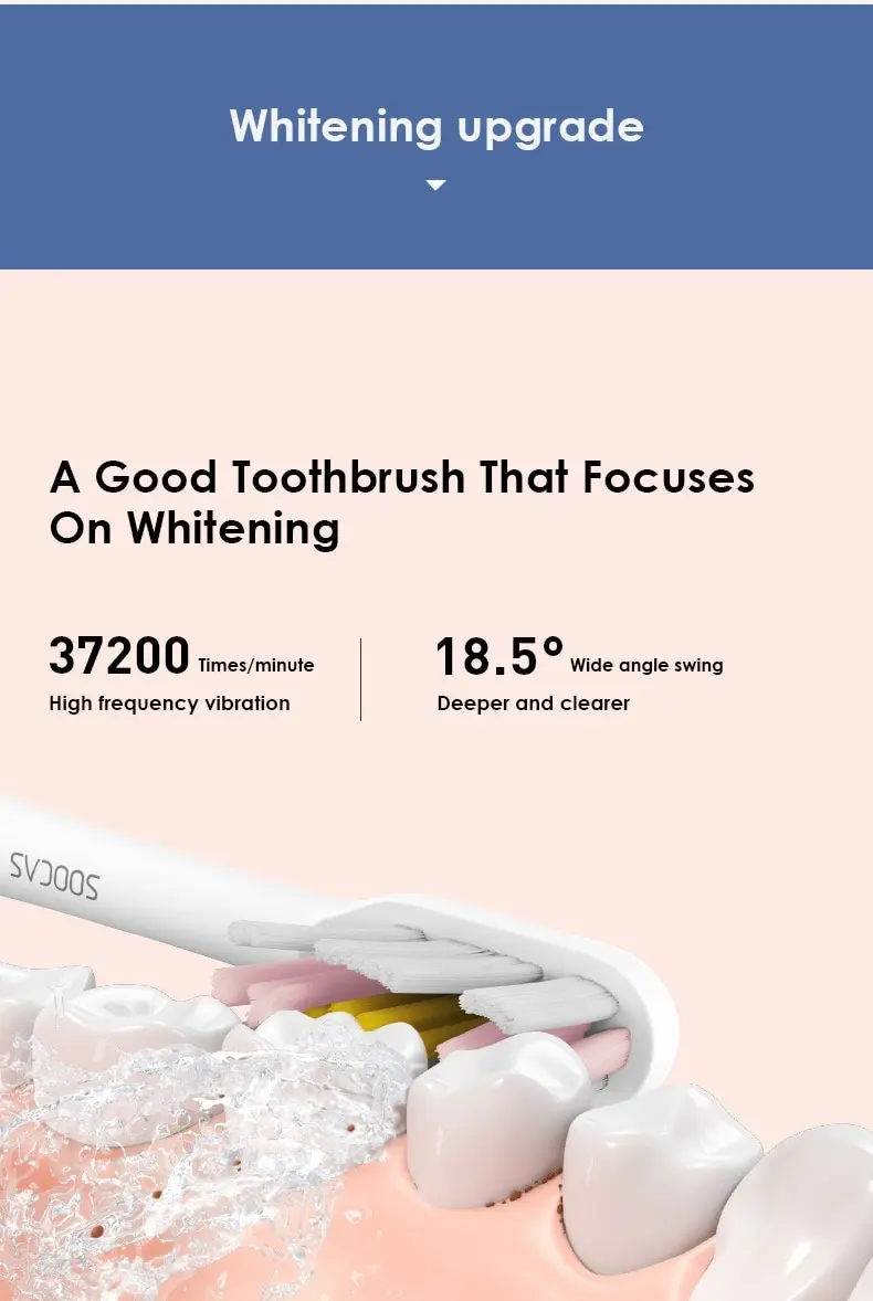 Режимы: чистка зубов, мягкая чистка, массаж, отбеливаниеСенсор давленияПитание: аккумулятор 1000 mAhНасадок в комплекте: 2Водоустойчивый корпус IPX7Управление со смартфонаКол-во движений в минуту: 37200Контроль нажатияМощный двигательЗащита от вибрацииНапоминания о смене области очисткиВ комплекте: зубная щетка, насадки, зарядка, стакан, кейсВес: 300 г.