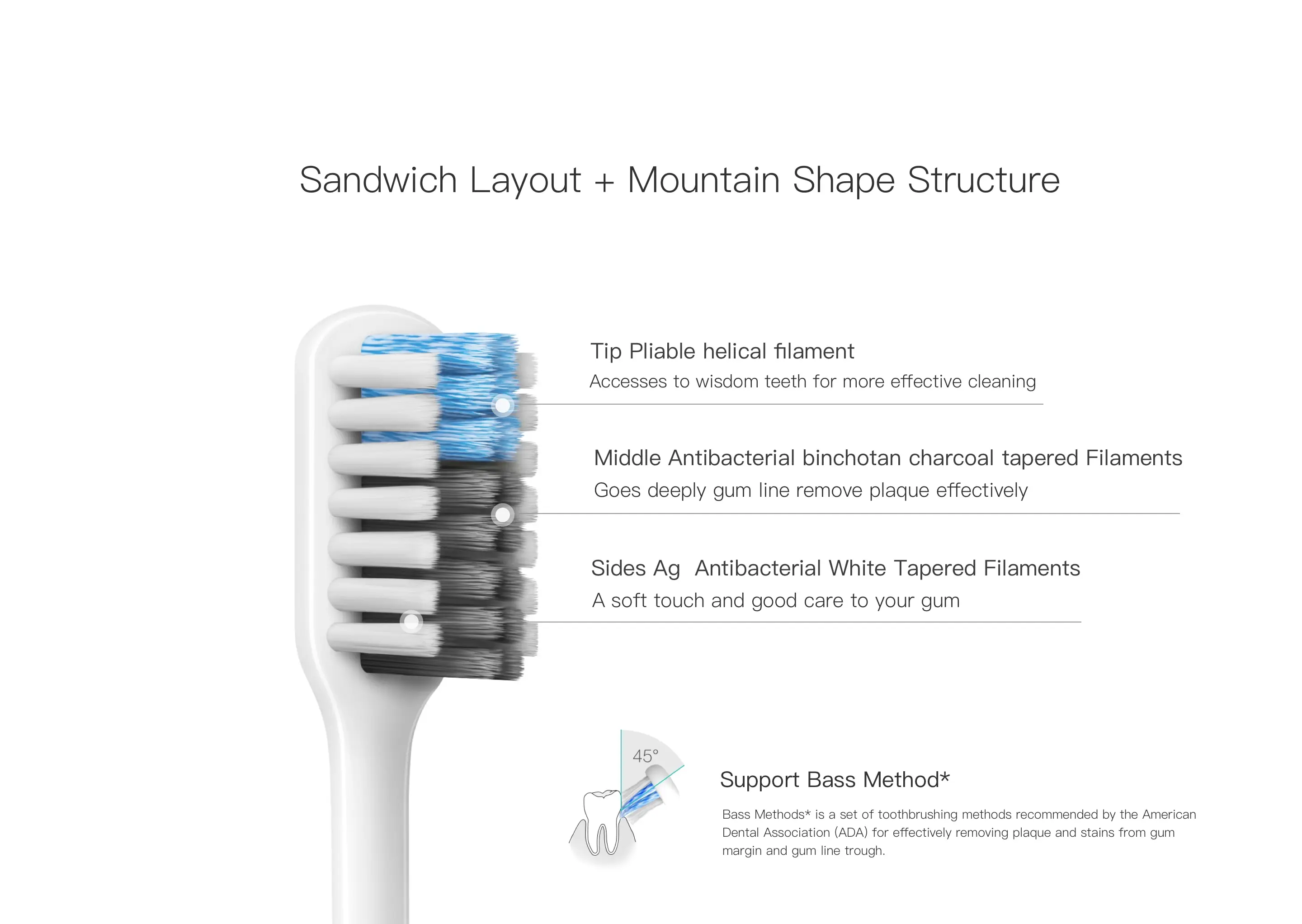 ая с отметками для пальцев3 типа нитей для щетинок:- с антибактериальным покрытием с ионами серебра- с угольным напылением для борьбы с микробами- эластичная щетина для труднодоступных местМягкая высококачественная щетина от немецкого и японского производителяЧистка создает мягкий массаж для десен и защищает от кровотечения3-х уровневая структура щетки в несколько рядов для лучшей чистки зубовКомплект:4 зубные щетки разного цвета.1 чехол для хранения и транспортировке зубной щетки