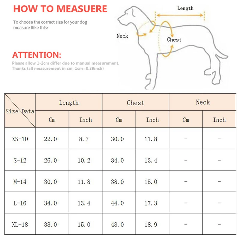 1. Пожалуйста, проверьте вашего питомца замеры изделий сделаны вручную, поэтому убедитесь в том, что одежда подходит для домашних животных перед тем, как вы заказываете (1 дюйм = 2,54 см)