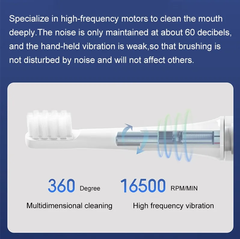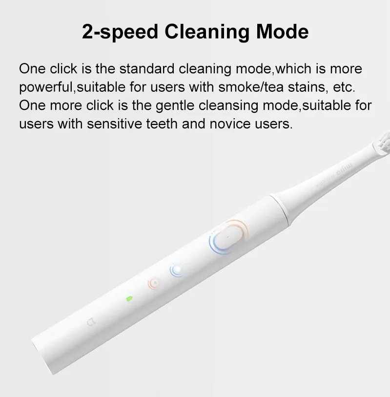 Особенности:* 16500 об./мин. высокой частоты вибрации, глубокое очищение полости рта в 360 градусов угол.* Импортные тонкие щетинки хороши для чистки зубов и ухода за зубами.* 2 уровня режимов очистки: стандартный режим очистки + режим мягкой очистки* 2 минуты научной чистки, 30 секунд зоны переключения напоминание* 4 часов подзарядки на расстоянии до 30 дней с сенсорной панелью* Водонепроницаемость IPX7, высокая безопасность* 46 г портативный светильник, электрическая зубная щетка с ручкой диаметром 19 мм идеально подходит для путешествий.* Маленькая круглая головка кисти, грубая противоскользящая ручка, эргономичный дизайн для размещения