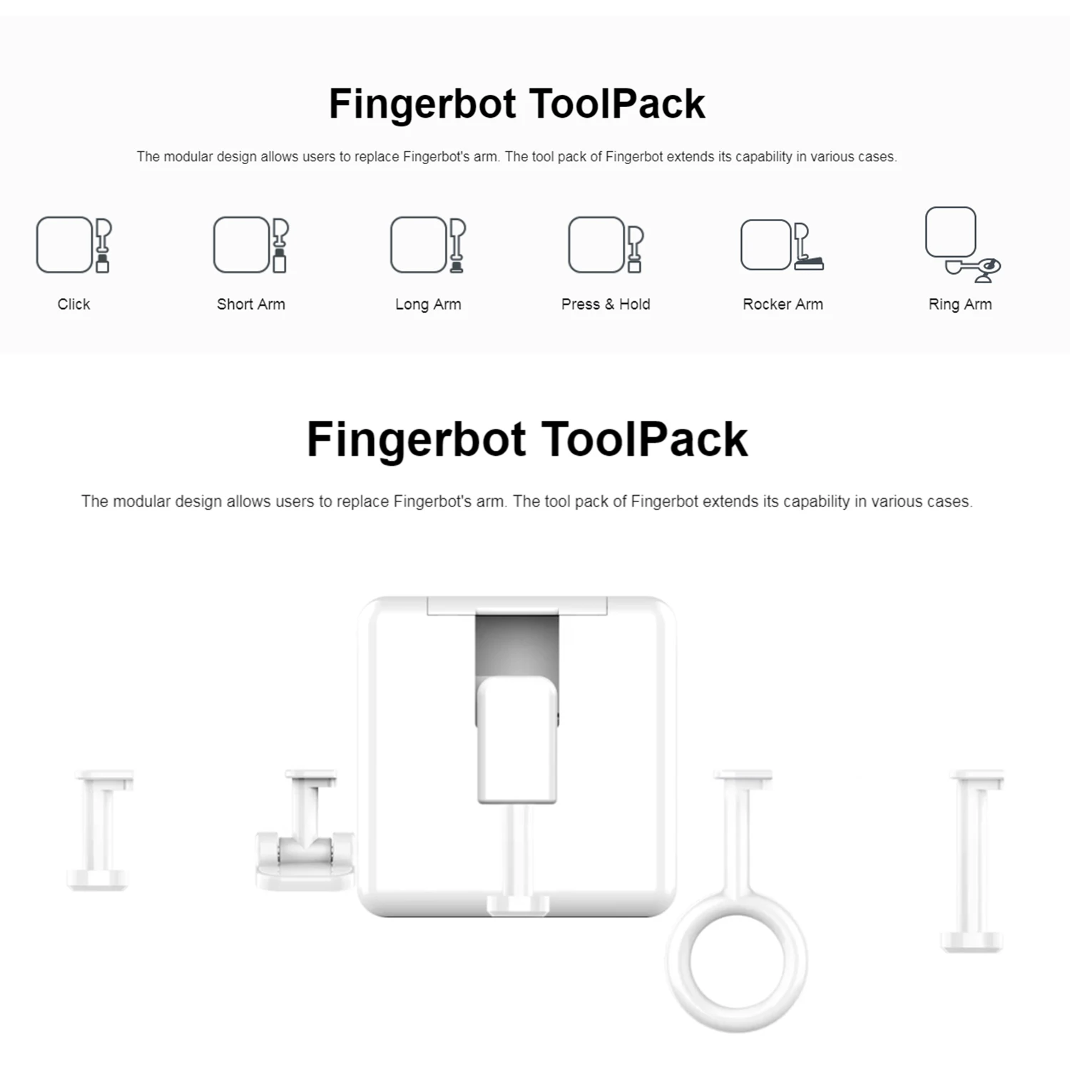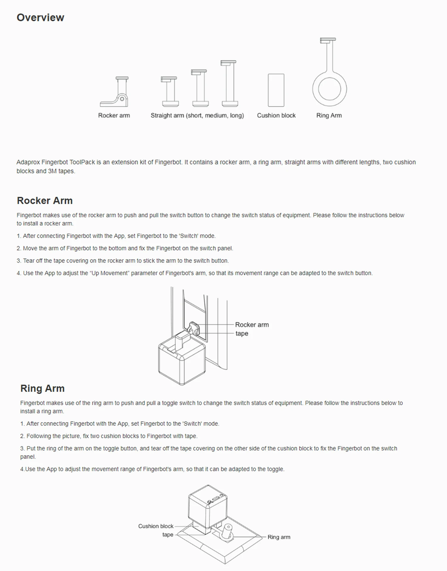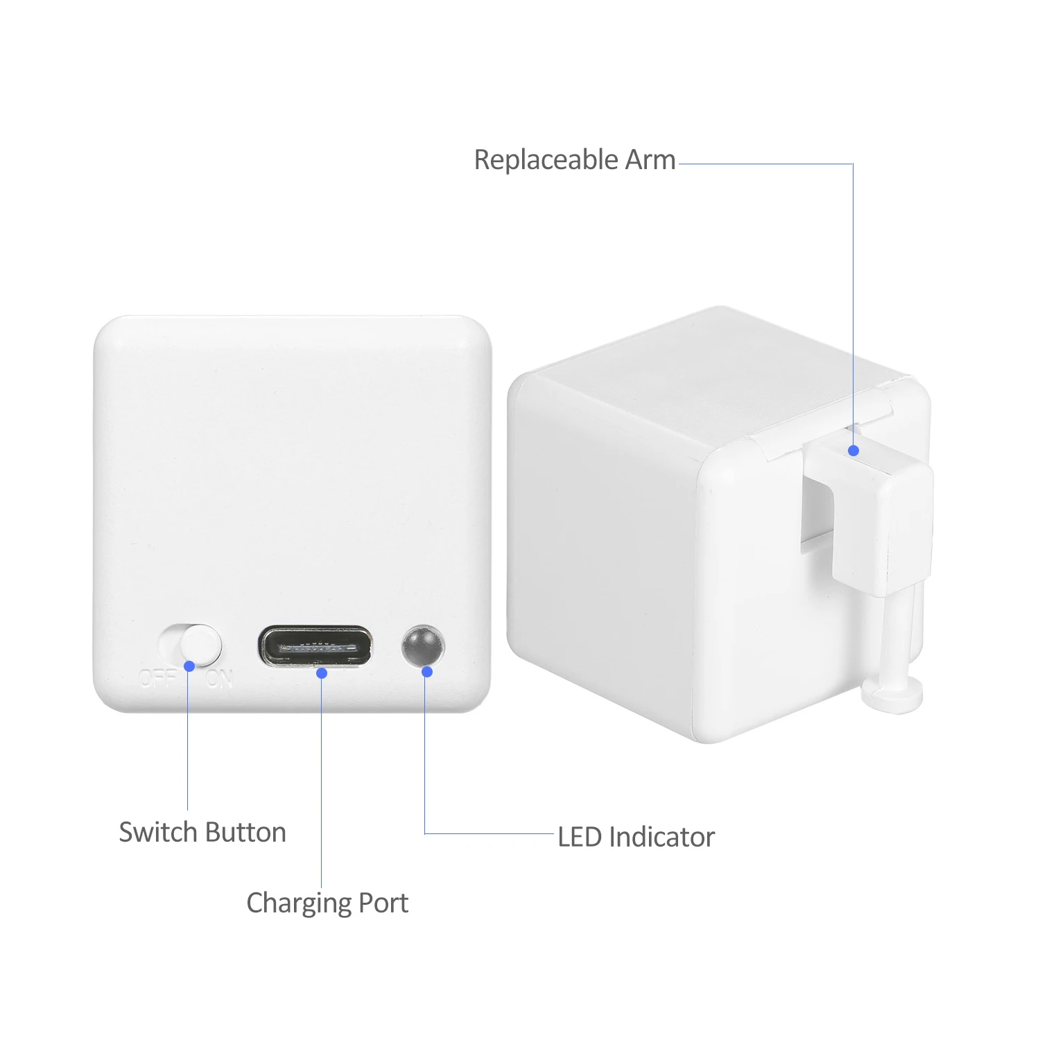 Fingerbot-самый маленький в мире робот для умного управления различными типами кнопок и переключателей. Он может управлять вашей существующей бытовой техникой с помощью роботизированных кликов. Включите свет через приложение, Запланируйте Утренний кофе, активируйте свой пылесос с голосовой командой и удаленно Включите свой офисный компьютер. Теперь все это становится легким с Fingerbot.Особенности: Требования к умным устройствам: Поддержка систем Android(Android 9,0 и выше) и iOS(iOS 11 и выше).Управление приложением: создайте учетную запись на вашем смартфоне, затем вы можете управлять Fingerbot через BT по беспроводной сети.Голосовое управление: поддержка голосовых помощников, таких как Google Home и Alexa. Вы можете настроить голосовые команды в приложении для активной функции голосового управления.Функция таймера: вы можете установить таймер в приложении. Когда время истекает, оно будет активировано автоматически.Сменная рукоятка: благодаря модульному дизайну рукоятка Fingerbot заменяется для удовлетворения различных потребностей в различных ситуациях.Установка устройства: Для установки вашего Fingerbot:1. Очистите поверхность панели кнопок, где вы хотите установить Fingerbot.2. Прикрепите его к панели с помощью двусторонней ленты, предоставленной в посылка Fingerbot.3. Подключите Fingerbot к приложению и откалибруйте движение роботизированной руки Fingerbot, чтобы соответствовать кнопке. Параметр «вниз» должен быть установлен на значение, при котором рука Fingerbot может просто нажать кнопку. Примечание: неправильные настройки движения могут вызвать дополнительное сопротивление и уменьшить срок службы вашего пальца.4. После установки мы рекомендуем использовать устройство в течение 24 часов для достижения максимальной адгезии.Характеристики: Тип: Fingerbot / Gateway / Fingerbot II White / Fingerbot II Black/аксессуары (опционально)Материал: АБС-пластикПротокол связи: BLE 4,2Поддержка системы: iOS 11 и выше, Android 9,0 и вышеКрутящий момент, крутящий момент: 2,0 кгс. СмМаксимальное движение руки: 12 ммРабочая температура: -10 ~ 45 ℃Батарея: 3V 150mAh CR2 литиевая батареяВес изделия: 39 г/1,40 унцийВес посылка: 54 г/1,93 унцийПосылка Размеры: 6*5,6*3,8 см/2,36*2,20 * 1.50inУпаковочный лист: 1 * Fingerbot5 * Двусторонняя лента1 * Руководство (на английском языке)