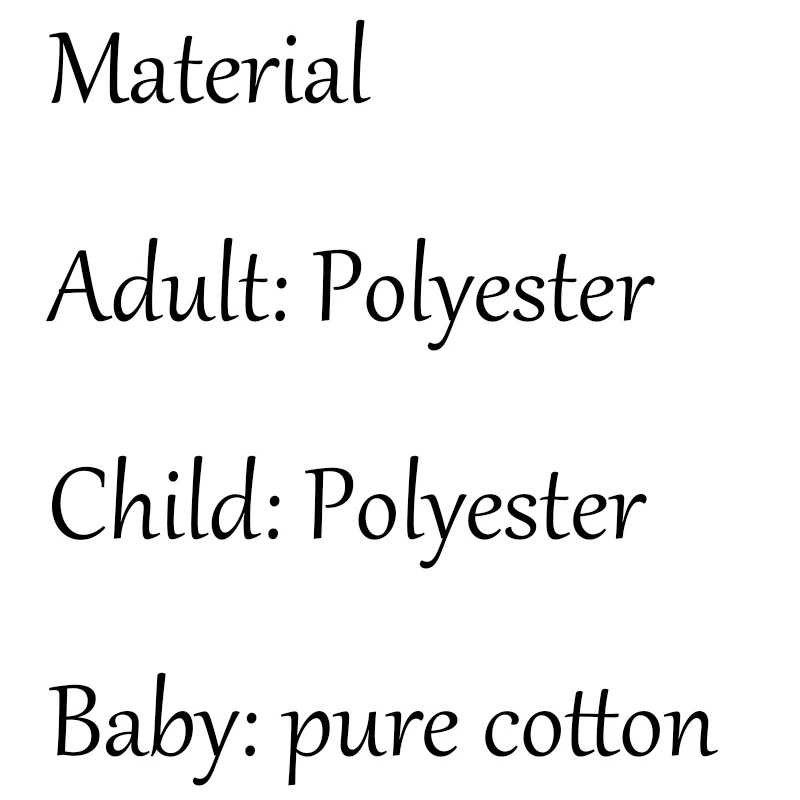 Дорогой друг, цена указана только за 1 штуку. Из-за разницы между различными мониторами изображение может не отражать фактический цвет изделия.Из-за ручного измерения возможна погрешность в 2-4 см, Таблица Размеров приведена только для справкиМатериалДля взрослых: полиэстер; Для малышей: хлопок