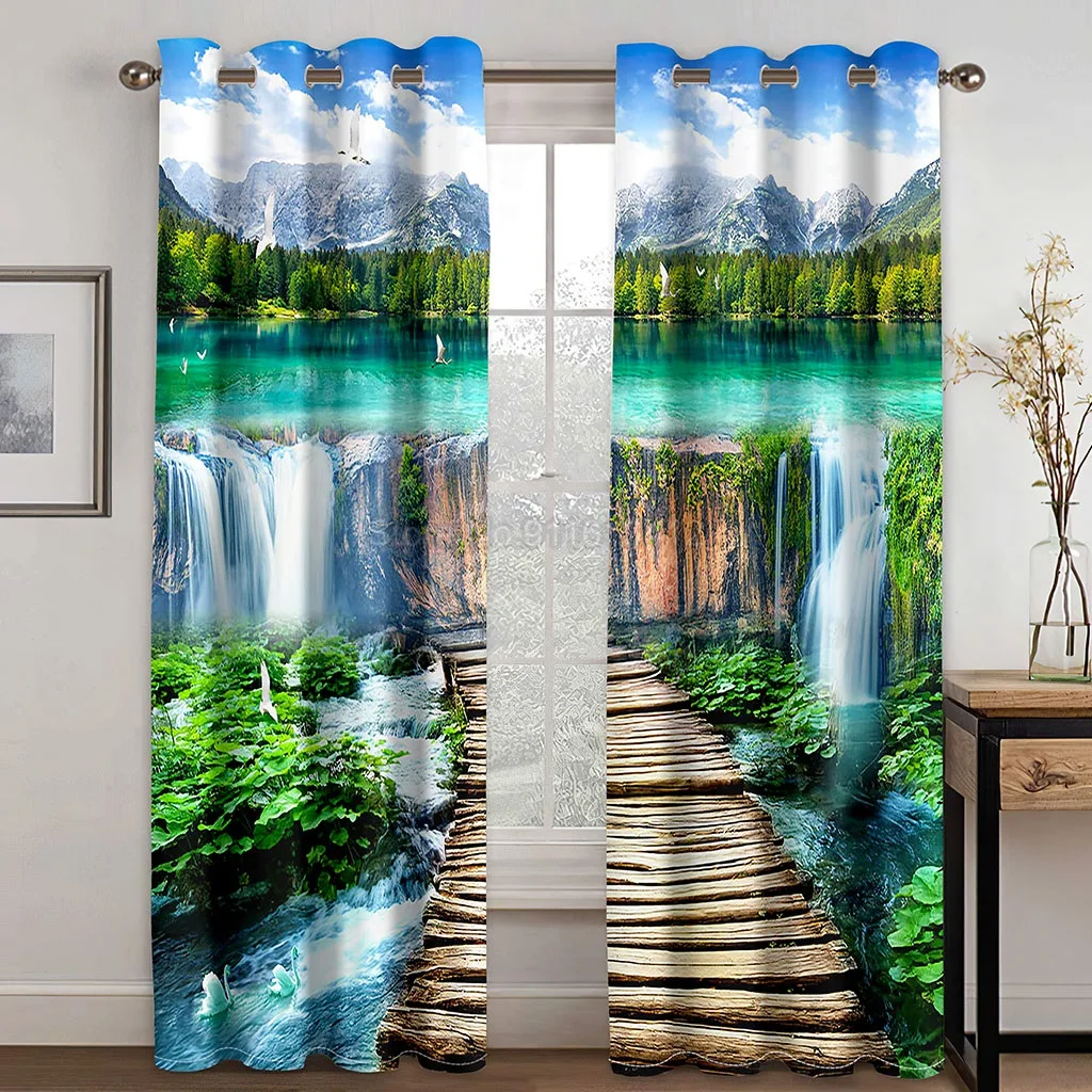 Затемняющие шторы с пейзажем, простые зеленые оконные занавески с 3D принтом, Водопад, для гостиной, спальни, фотозанавески