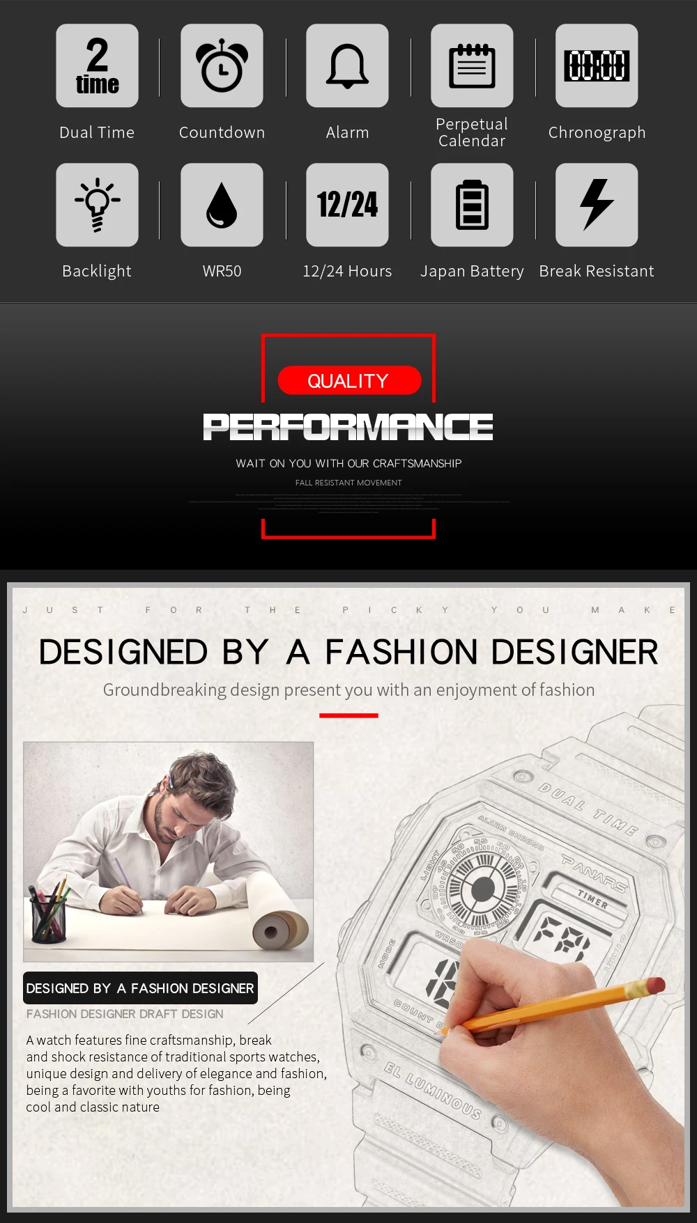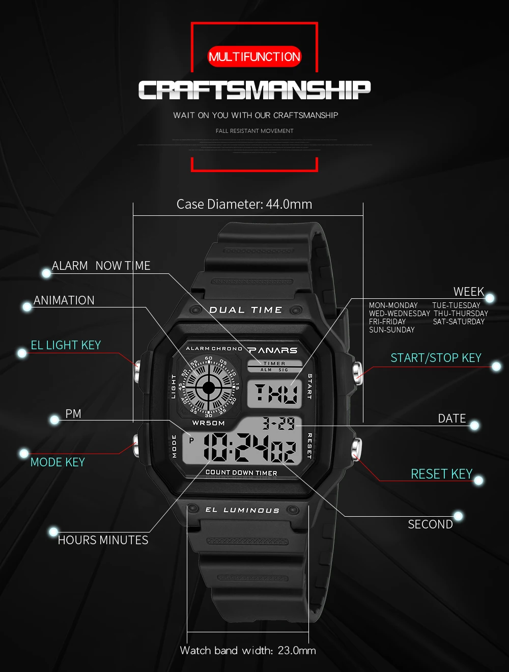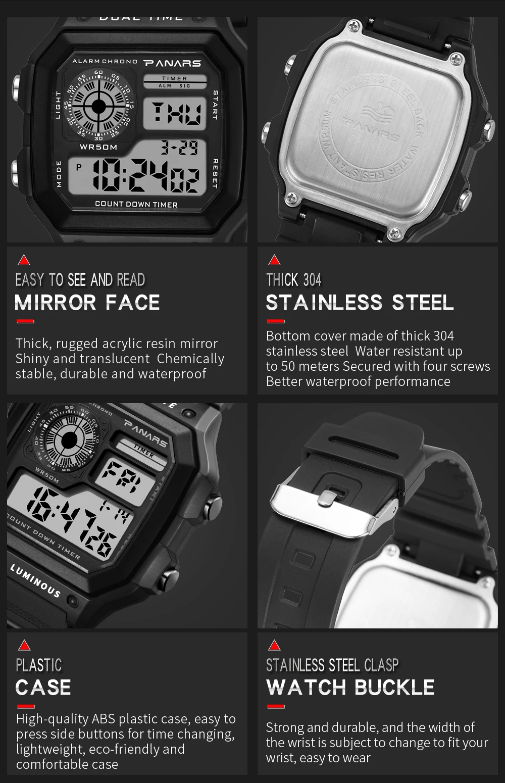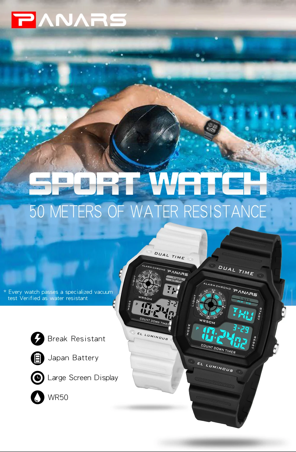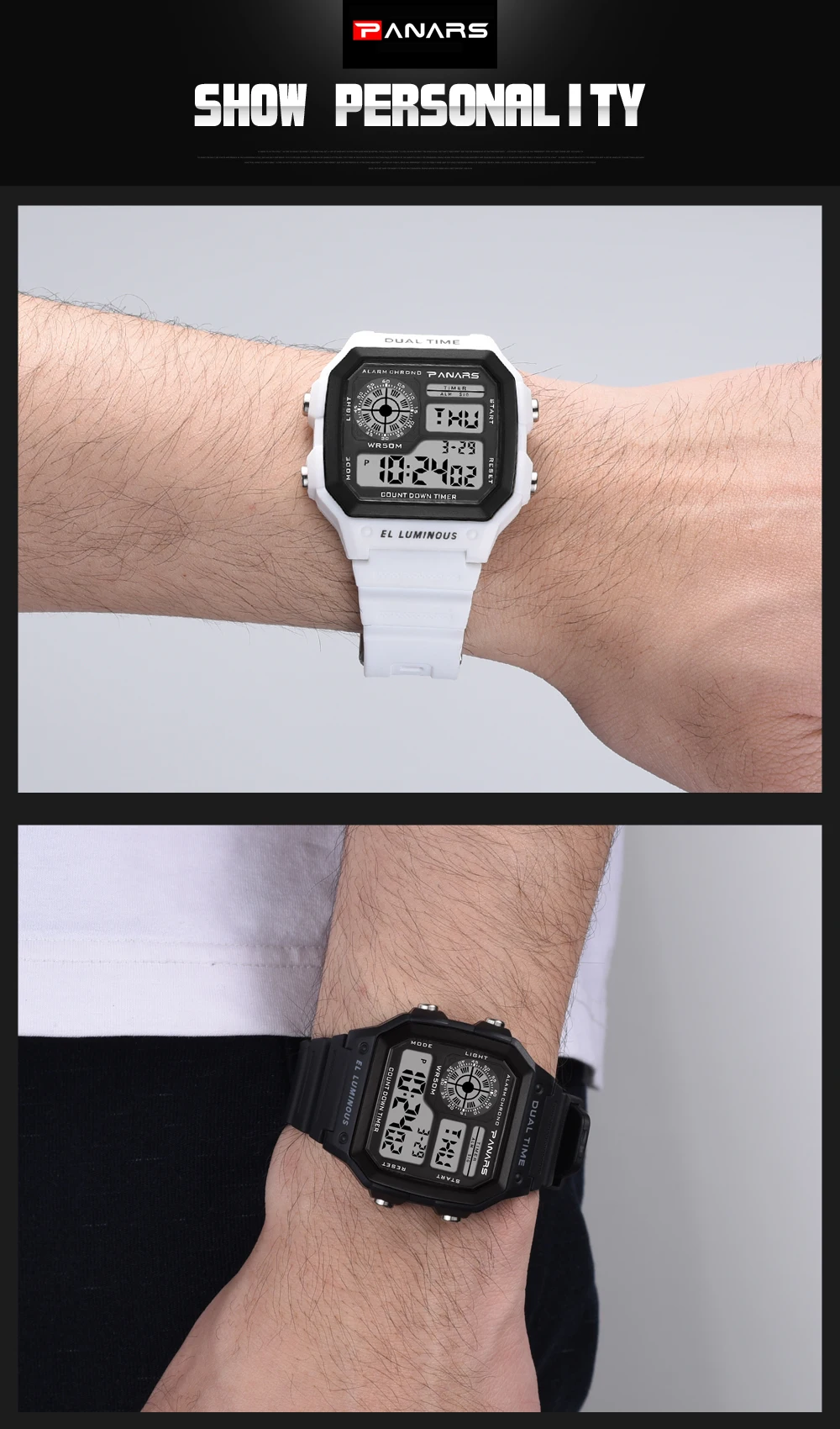 Описание товара:1. Бренд: PANARS Модель: 81142. Многофункциональные электронные часы3. Водонепроницаемость 50 м4. Тип: мужские спортивные часы5. Есть 5 цветов на выбор6. Ширина ремешка: (приблизительно) 23 см7. Диаметр циферблата: (прибл.) 44 см8. Чехол Толщина: 13,2 см9.-ширина ремешка: Длина: 26,5 см10. Материал ремешка: прочный ТПУ11. Материал корпуса: прочная резина + АБС-пластикПримечание: Мы рекомендуем не носить его во время плавания. Но если вы идете плавать или нырять, пожалуйста, не нажимайте кнопки под водой!Компоненты в комплекте:-1 x оригинальные часы SANDA-Руководство по эксплуатации-1 шт.