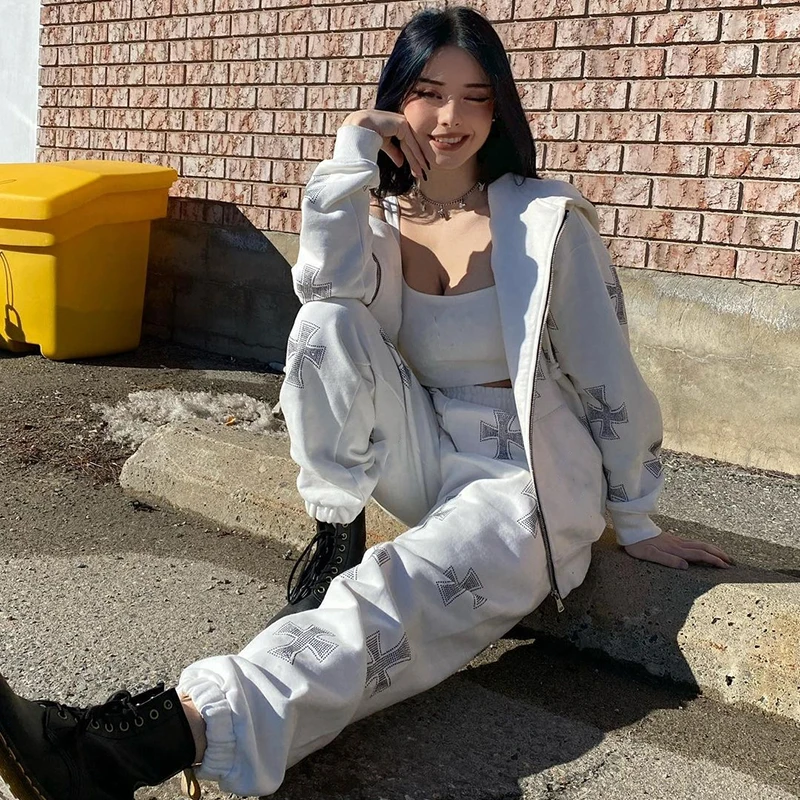 Y2k Harajuku Cross Стразы прямые широкие брюки костюм женские амери...