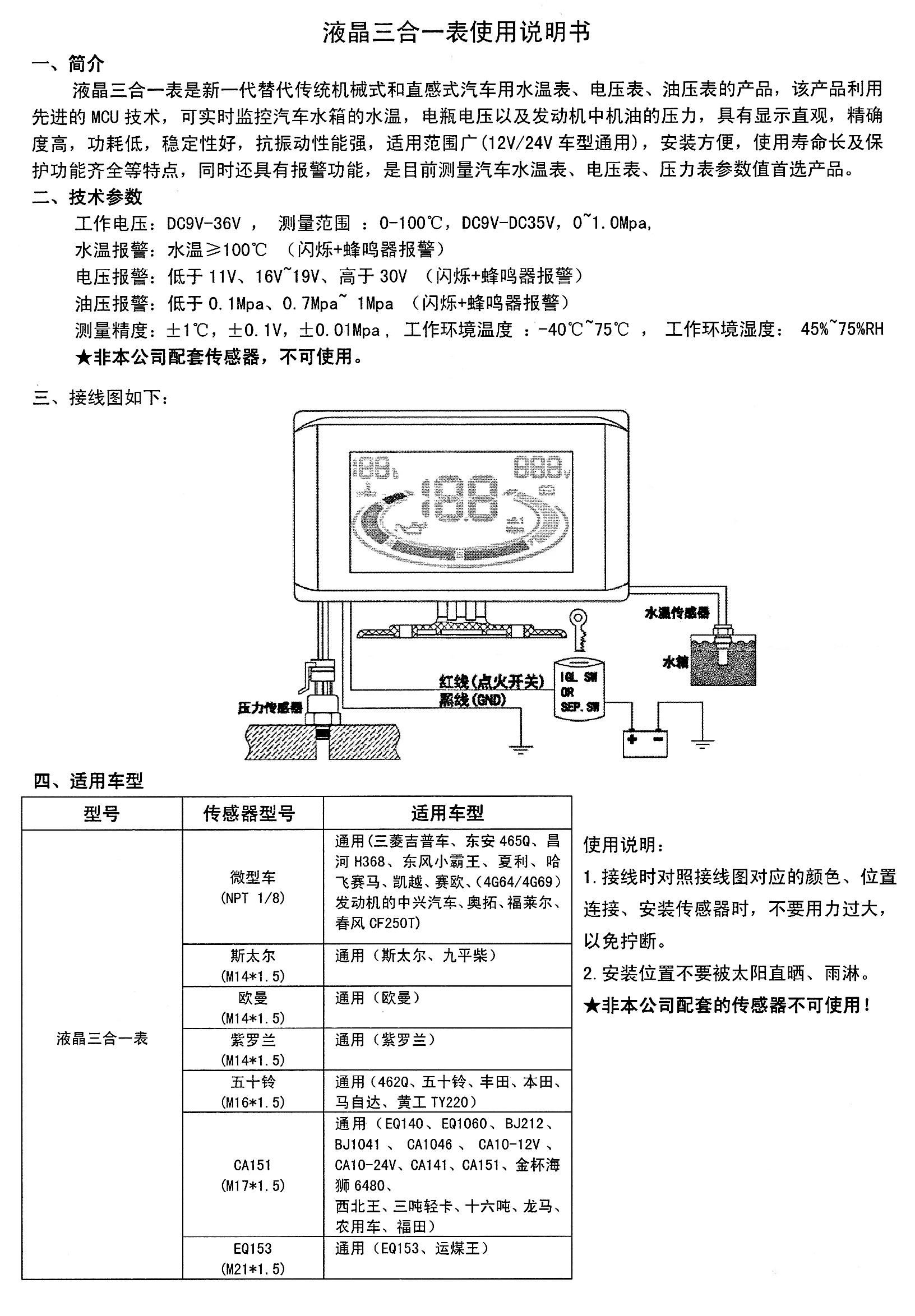 -Название: Автомобильный ЖК-дисплей 3 в 1 (датчик температуры воды/давления масла/напряжения)-Материал: пластиковый корпус-Размер изделия: 55 мм * 199 мм * 14 мм-Длина кабеля питания: около 50 см-Красный --- мощность +-(Красный, черный) --- питание--Источник питания: 9 В постоянного тока-36 в-Диапазон измерения давления: 0,00-1.00Mpa-Точность: +/-1%-Измерение давления масла: (0 ~ 10)* 0.1Mpa, когда напряжение тревоги-ниже 10 В, 16-20 в, выше 31 В, будильник будет мигать.-Температура окружающей среды: -10 ℃-50 ℃-Скорость измерения: 3-5 секунд-Измеритель температуры воды: Диапазон измерения:-10 ℃-110 ℃