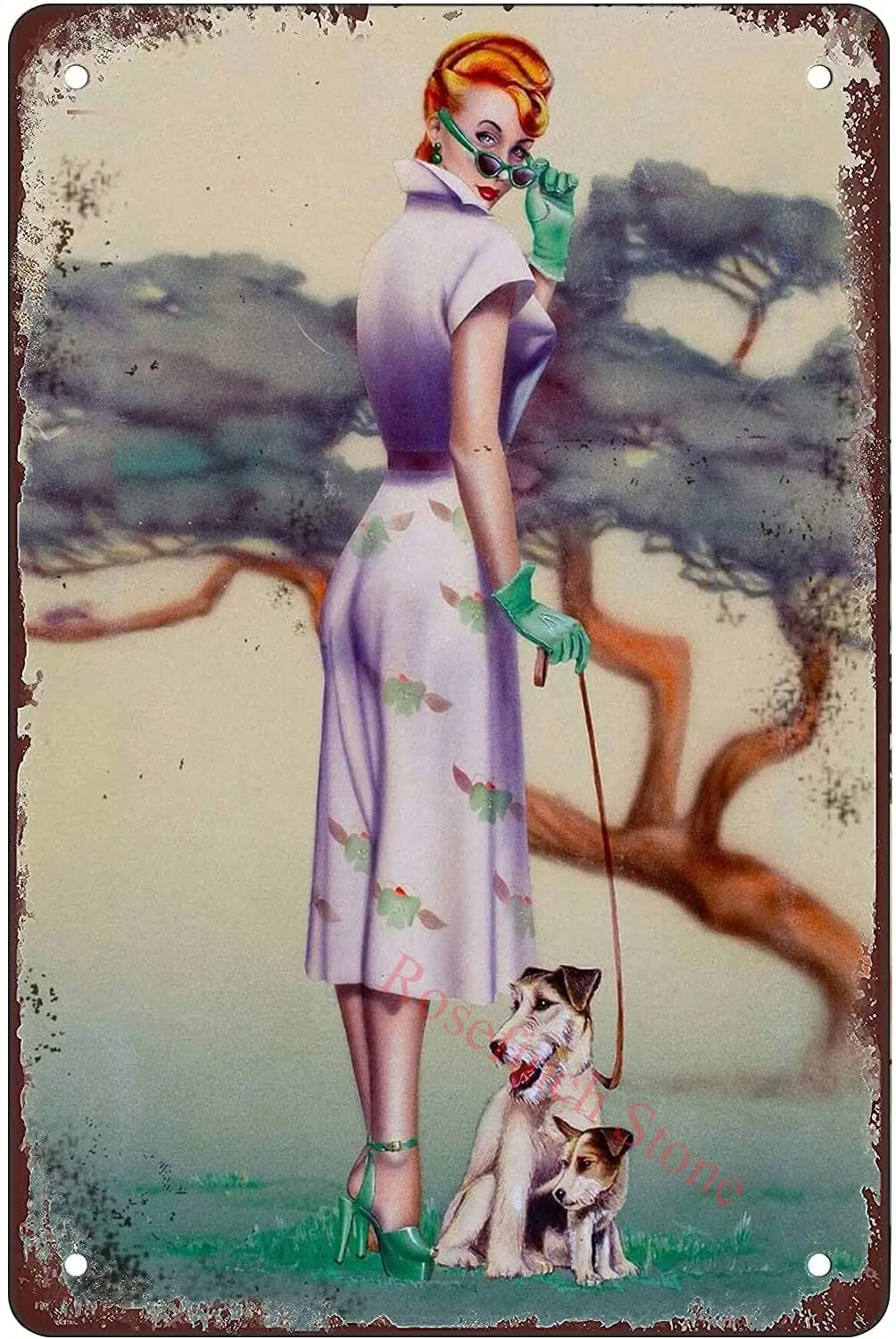Забавный жестяной знак Rosefinch Stone 1940s Pin Up Girl Wire Fox Terrier Dog для спальни, ресторана, бара, ванной комнаты, настенное украшение 8X12