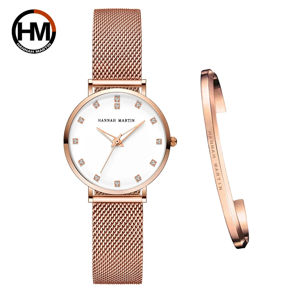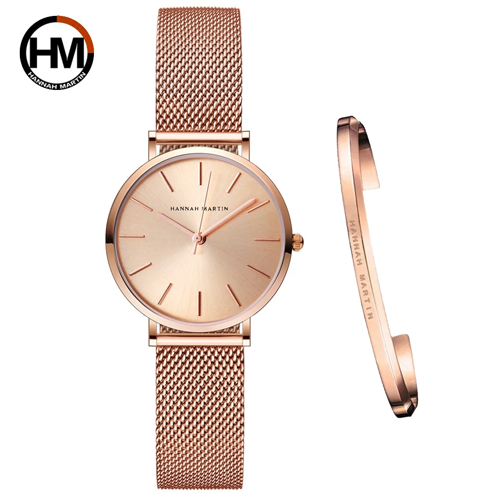 Японские Женские кварцевые часы MIYOTA 2035 с браслетом и сетчатым ремешком из нержавеющей стали, водонепроницаемые часы цвета розового золота для женщин