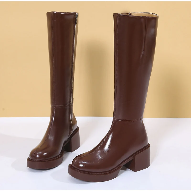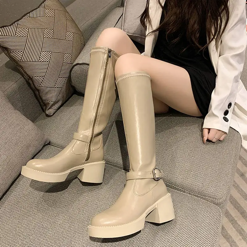 Женские кожаные сапоги до колена, однотонные классические сапоги на платформе и квадратном каблуке с застежкой-молнией и пряжкой, 2021
