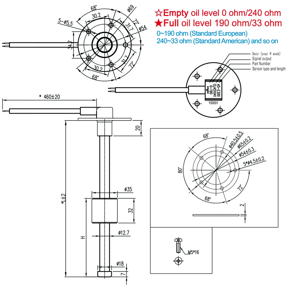 Длина датчика:100 мм, 125 мм, 150 мм, 175 мм, 200 мм, 225 мм, 250 мм, 300 мм, 350 мм, 400 мм, 450 мм, 500 мм, 550 мм, 600 мм, 650 мм, 700 мм, 800/900,1000 мм и так далееВыходной сигнал:0-190 Ом (стандартный европейский)240-33 Ом (Стандартный американский)Примечание:Длина и выходной сигнал датчика могут быть настроены, если вам нужны другие размеры или выходной сигнал, пожалуйста, свяжитесь с нами в любое время, мы можем настроить любой размер для вас. Спасибо!