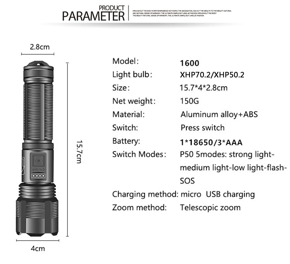 Тип лампы: T6 / U3 / V6Переключатель: кнопочный переключательЦвет: черныйСветильник режим: высокий/низкий/стробоскопическийСрок службы: 100000 часовЗум: Телескопический масштабируемыйВодонепроницаемость: IPX5, не поддерживает погружение.Аккумулятор: 1x18650Материал: алюминиевый сплав
