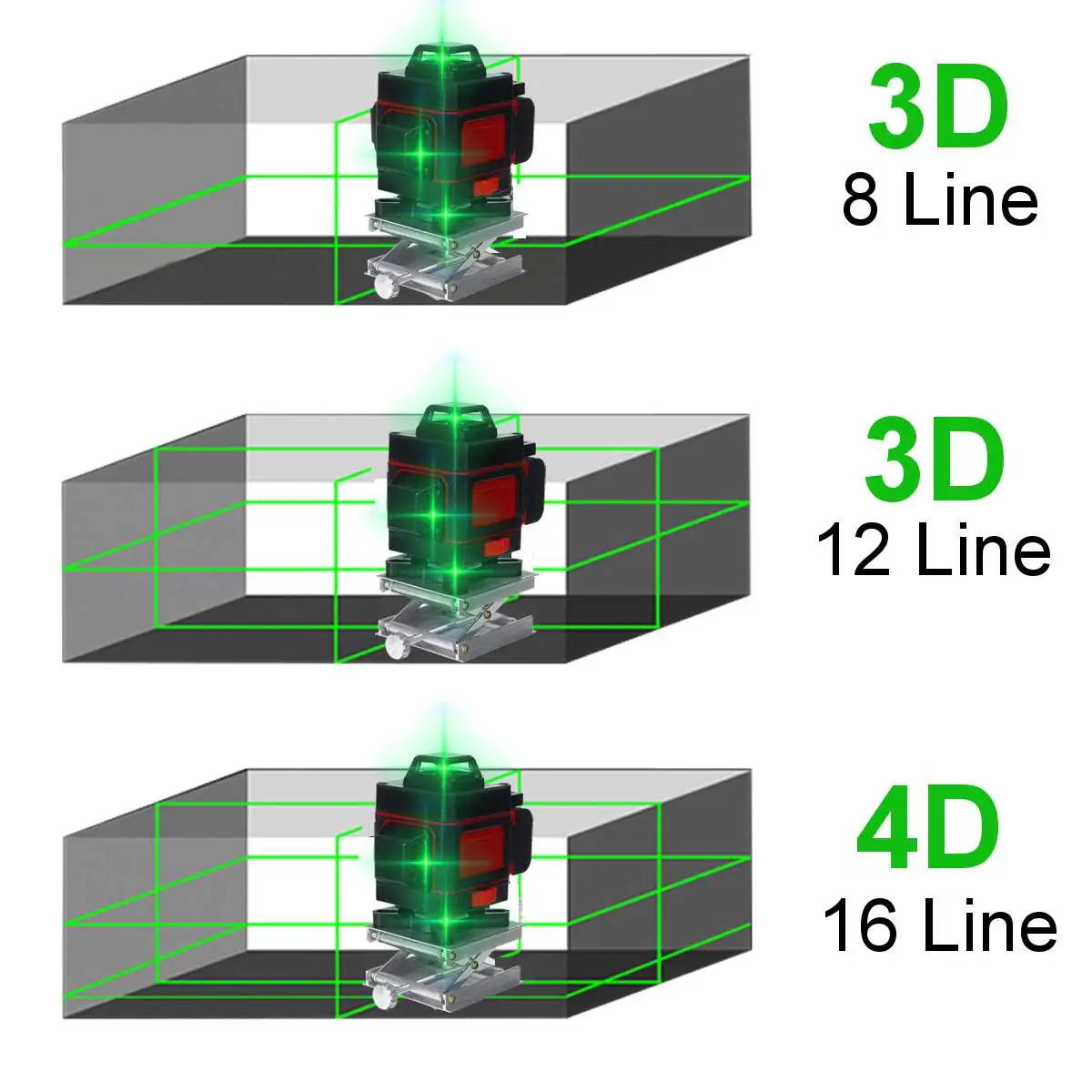 Особенности:● Цифровой дисплей питания● Интеллектуальный пульт дистанционного управления, пульт дистанционного управления, своевременный и чувствительный ответ● Автоматическое выравнивание, звуковой сигнал и светильник● Литиевая батарея большой емкости, прочная● Удобная и Чувствительная Сенсорная кнопка● Водонепроницаемый и пылезащитный● Точная настройка базы● Функция произвольной строчки● Супер яркий светильник, видимый внутри и снаружи● Высокоточный светильник, миллиметровый уровень● Механический маятниковый интегрированный дизайнПрименение: лазерный уровень