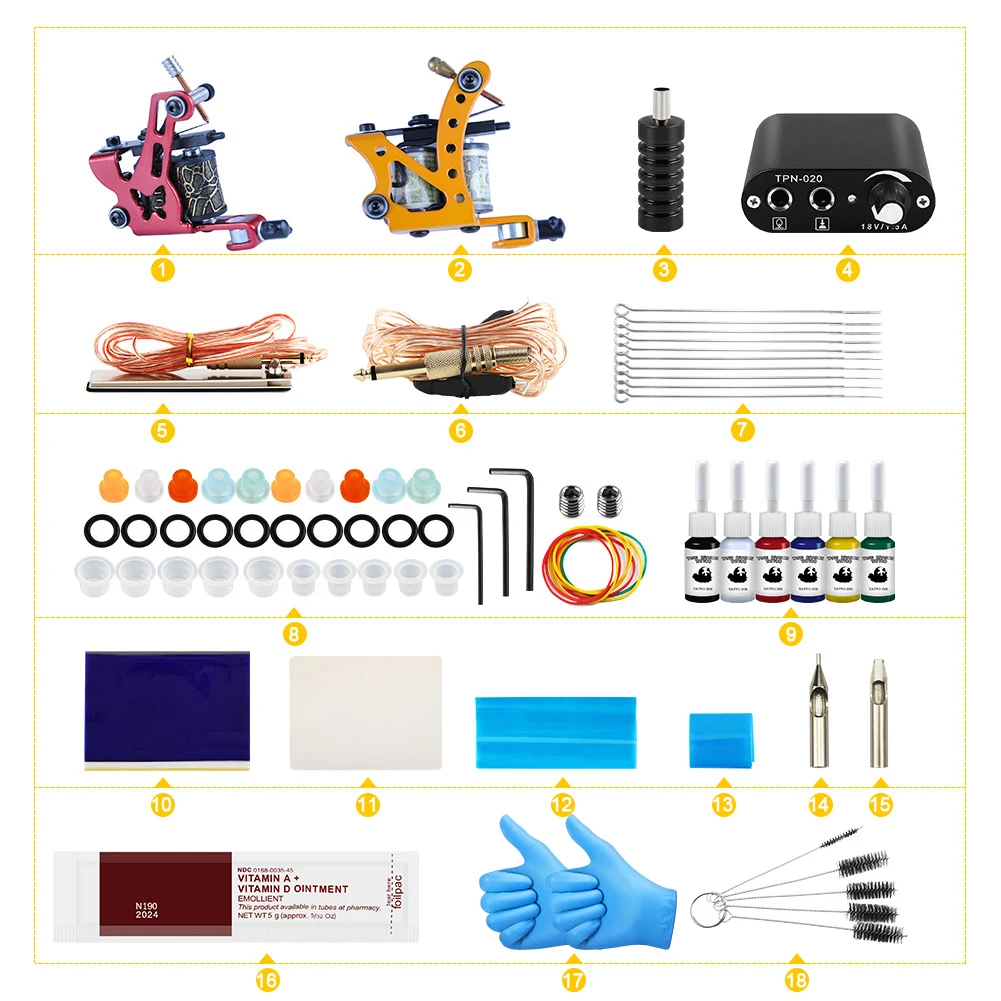 1 × ЖК-источник питания с кабелем1 × доллар шаблон тату машина для подкладки1 × доллар тату машина для затенения1 × машинка для татуировки бабочки для затенения1 × 2 шт. тату из нержавеющей стали (5R, 5F)1 × 10 шт иглы татуировки (5RL, 5M1)1 × 20 шт тату чернила1 × 6 частей тату аксессуаров1 × ручка для татуировки1 × чехол с зажимом1 × чехол для тату-машины1 × белая кожа для тату1 × Бумага для переноса татуировок1 × после крема2 × одноразовые перчатки1 × кисть для татуировки1 × зажим1 × педаль