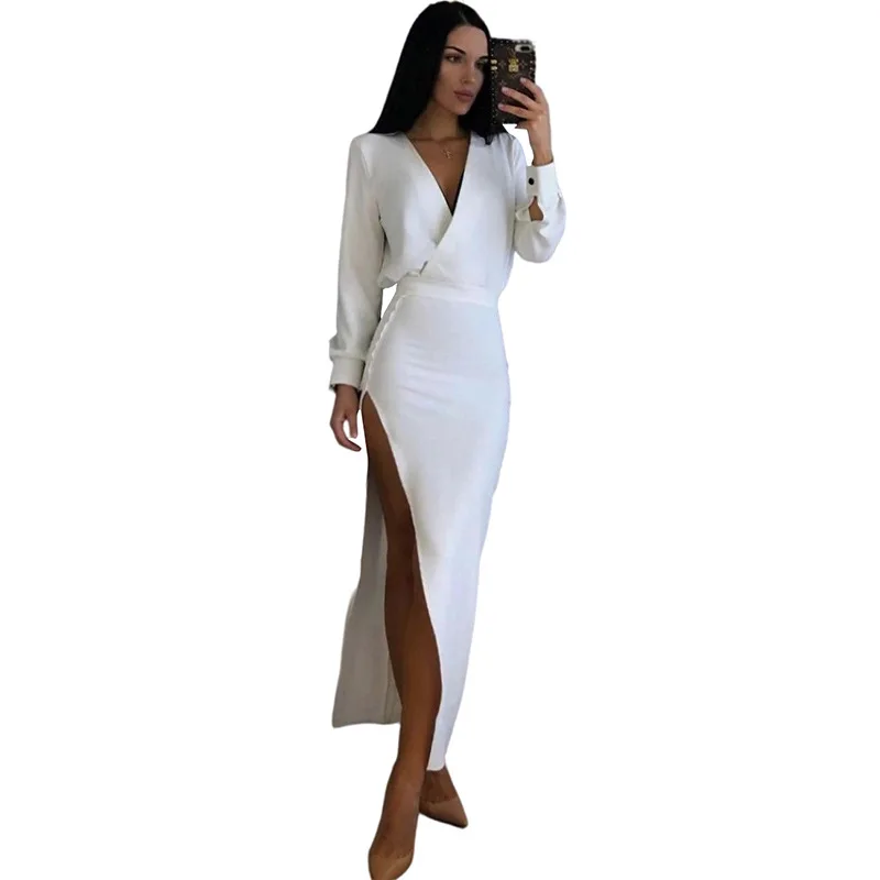 Сексуальное Белое платье Churses с V-образным вырезом и высоким раз...