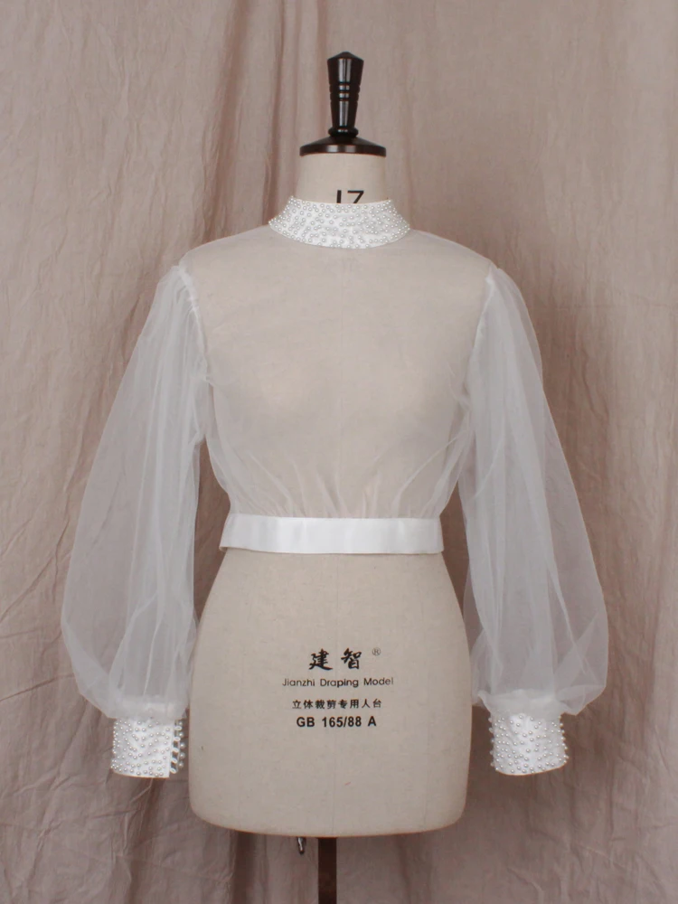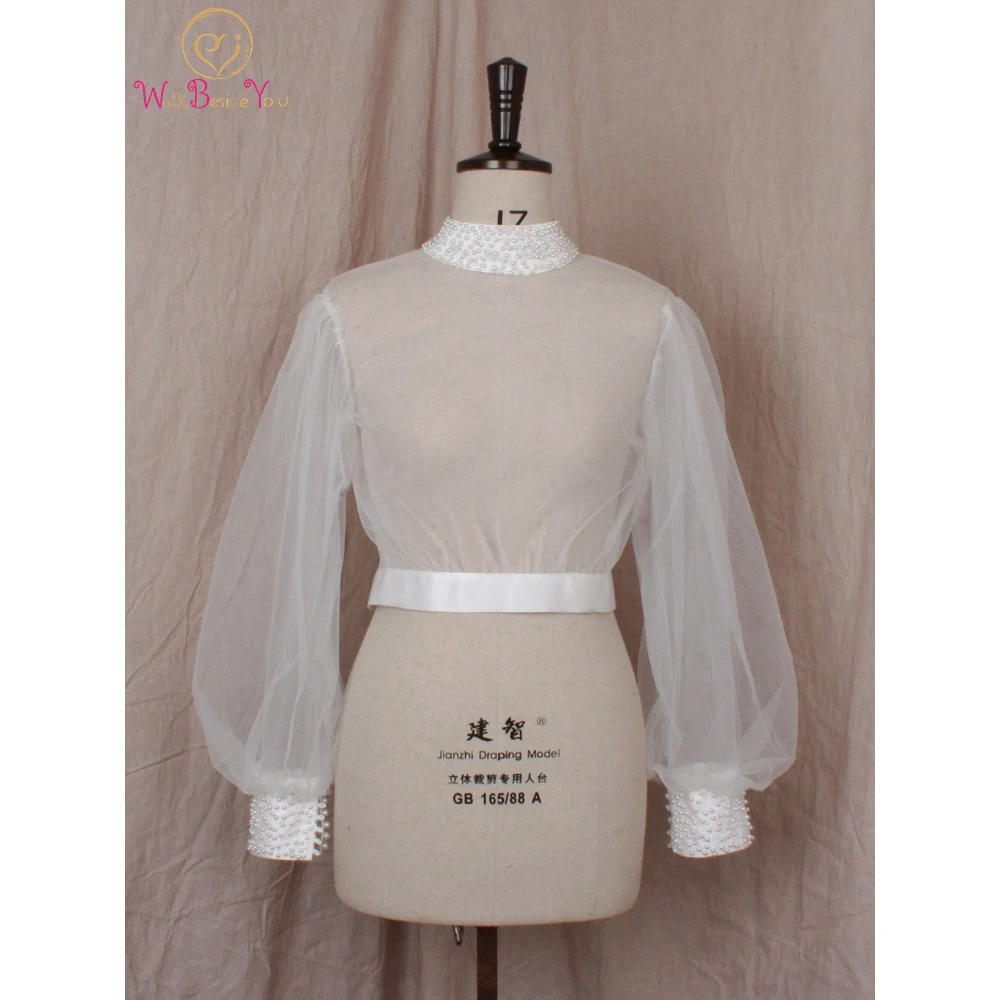 Женский тюлевый пиджак с жемчужинами, бежевый Свадебный топ с длинными рукавами и высоким воротником, накидка для невесты, оптовая продажа